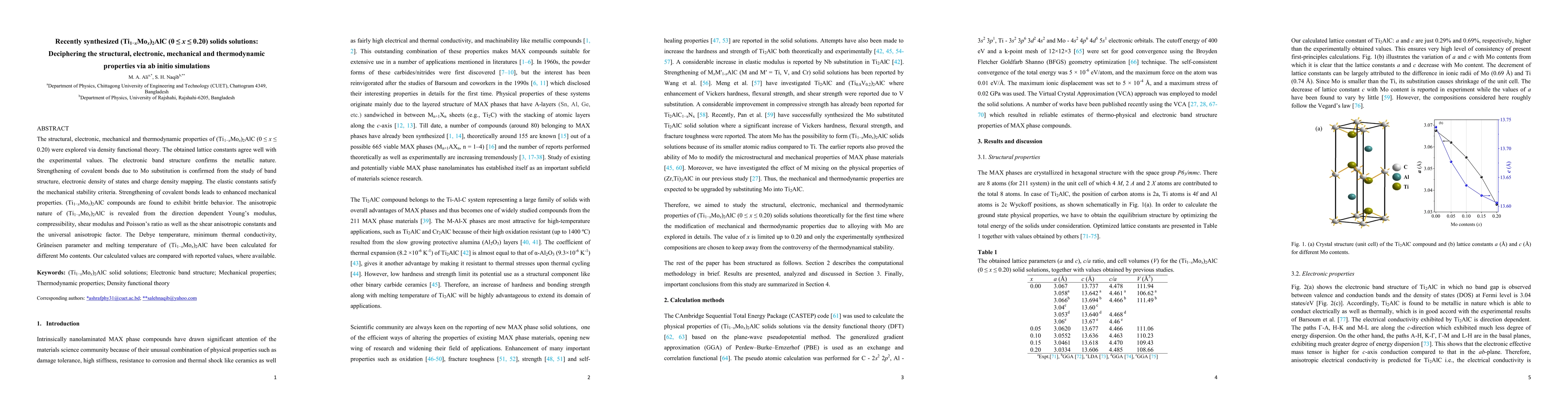 The structural, electronic, mechanical and thermodynamic properties of (Ti1-xMox)2AlC (0 < x < 0.20) were explored via density functional theory. The obtained lattice constants agree well with the experimental values. The electronic band structure confirms the metallic nature. Strengthening of covalent bonds due to Mo substitution is confirmed from the study of band structure, electronic density of states and charge density mapping. The elastic constants satisfy the mechanical stability criteria. Strengthening of covalent bonds leads to enhanced mechanical properties. (Ti1-xMox)2AlC compounds are found to exhibit brittle behavior. The anisotropic nature of (Ti1-xMox)2AlC is revealed from the direction dependent Young's modulus, compressibility, shear modulus and Poisson's ratio as well as the shear anisotropic constants and the universal anisotropic factor. The Debye temperature, minimum thermal conductivity, Gruneisen parameter and melting temperature of (Ti1-xMox)2AlC have been calculated for different Mo contents. Our calculated values are compared with reported values, where available.