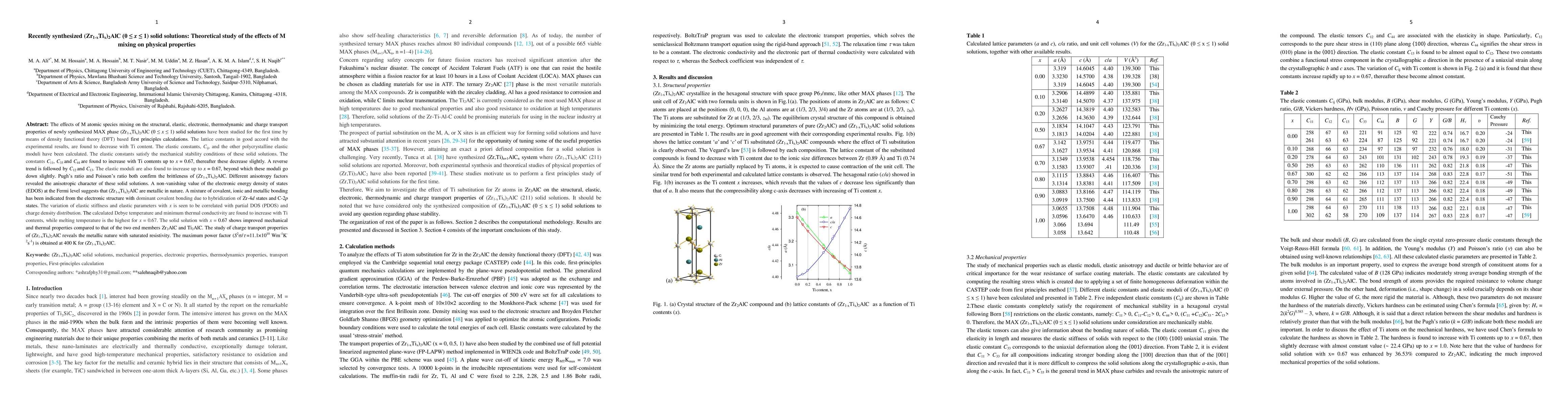 The effects of M atomic species mixing on the physical properties of newly synthesized MAX phase (Zr1-xTix)2AlC solid solutions have been studied by means of density functional theory (DFT) calculations. The lattice constants in good accord with the experimental results, are found to decrease with Ti content. The elastic constants, Cij, and the other polycrystalline elastic moduli have been calculated. The elastic constants satisfy the mechanical stability conditions of these solid solutions. The constants C11, C33 and C44 are found to increase with Ti contents up to x = 0.67, thereafter these decrease slightly. A reverse trend is followed by C12 and C13. The elastic moduli are also found to increase up to x = 0.67, beyond which these moduli go down slightly. Pughs ratio and Poissons ratio both confirm the brittleness of (Zr1-xTix)2AlC. Different anisotropy factors revealed the anisotropic character of these solid solutions. A non-vanishing value of the electronic energy density of states (EDOS) at the Fermi level suggests that (Zr1-xTix)2AlC are metallic in nature. A mixture of covalent, ionic and metallic bonding has been indicated from the electronic structure with dominant covalent bonding due to hybridization of Zr-4d states and C-2p states. The variation of elastic stiffness and elastic parameters with x is seen to be correlated with partial DOS (PDOS) and charge density distribution. The calculated Debye temperature and minimum thermal conductivity are found to increase with Ti contents, while melting temperature is the highest for x = 0.67. The solid solution with x = 0.67 shows improved mechanical and thermal properties compared to that of the two end members Zr2AlC and Ti2AlC. The study of charge transport properties of (Zr1-xTix)2AlC reveals the metallic nature with saturated resistivity. The maximum power factor is obtained at 400 K for (Zr1-xTix)2AlC.