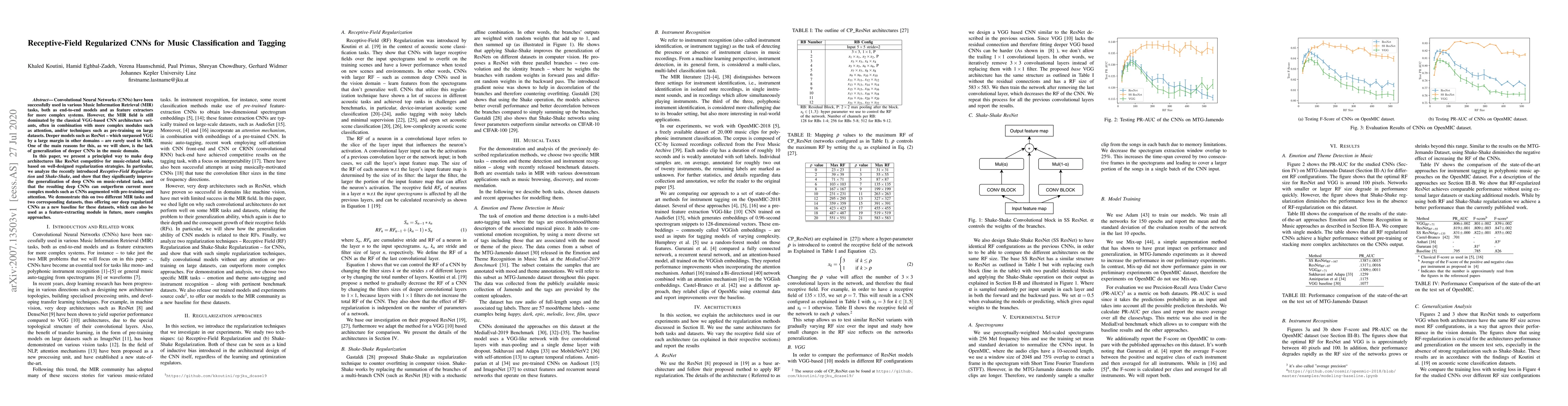 Convolutional Neural Networks (CNNs) have been successfully used in various Music Information Retrieval (MIR) tasks, both as end-to-end models and as feature extractors for more complex systems. However, the MIR field is still dominated by the classical VGG-based CNN architecture variants, often in combination with more complex modules such as attention, and/or techniques such as pre-training on large datasets. Deeper models such as ResNet -- which surpassed VGG by a large margin in other domains -- are rarely used in MIR. One of the main reasons for this, as we will show, is the lack of generalization of deeper CNNs in the music domain. In this paper, we present a principled way to make deep architectures like ResNet competitive for music-related tasks, based on well-designed regularization strategies. In particular, we analyze the recently introduced Receptive-Field Regularization and Shake-Shake, and show that they significantly improve the generalization of deep CNNs on music-related tasks, and that the resulting deep CNNs can outperform current more complex models such as CNNs augmented with pre-training and attention. We demonstrate this on two different MIR tasks and two corresponding datasets, thus offering our deep regularized CNNs as a new baseline for these datasets, which can also be used as a feature-extracting module in future, more complex approaches.