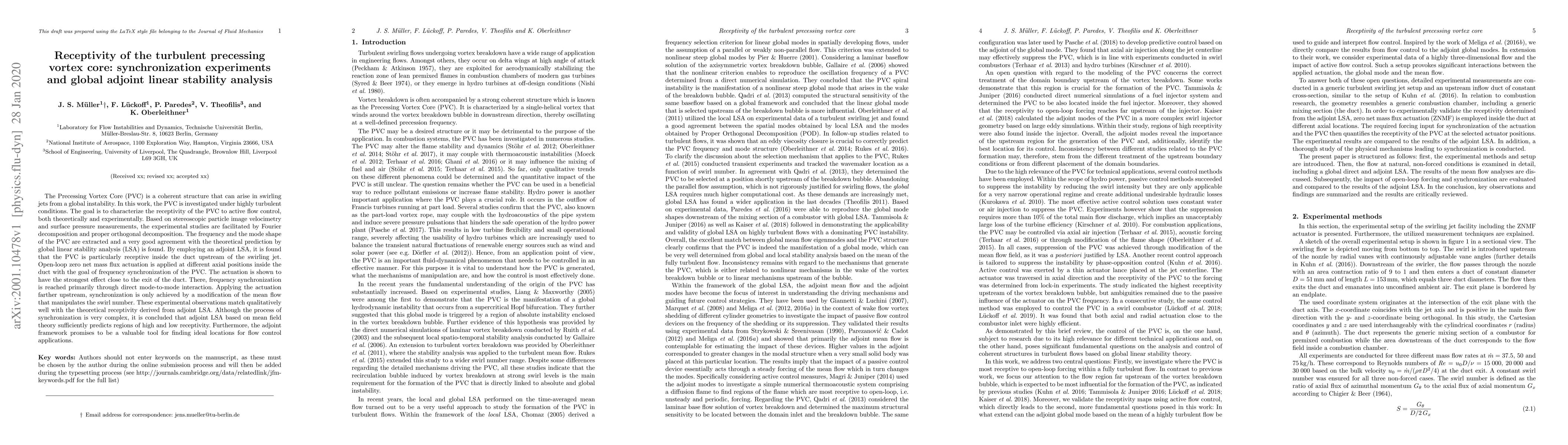 The Precessing Vortex Core (PVC) is a coherent structure that can arise in swirling jets from a global instability. In this work, the PVC is investigated under highly turbulent conditions. The goal is to characterize the receptivity of the PVC to active flow control, both theoretically and experimentally. Based on stereoscopic particle image velocimetry and surface pressure measurements, the experimental studies are facilitated by Fourier decomposition and proper orthogonal decomposition. The frequency and the mode shape of the PVC are extracted and a very good agreement with the theoretical prediction by global linear stability analysis (LSA) is found. By employing an adjoint LSA, it is found that the PVC is particularly receptive inside the duct upstream of the swirling jet. Open-loop zero net mass flux actuation is applied at different axial positions inside the duct with the goal of frequency synchronization of the PVC. The actuation is shown to have the strongest effect close to the exit of the duct. There, frequency synchronization is reached primarily through direct mode-to-mode interaction. Applying the actuation farther upstream, synchronization is only achieved by a modification of the mean flow that manipulates the swirl number. These experimental observations match qualitatively well with the theoretical receptivity derived from adjoint LSA. Although the process of synchronization is very complex, it is concluded that adjoint LSA based on mean field theory sufficiently predicts regions of high and low receptivity. Furthermore, the adjoint framework promises to be a valuable tool for finding ideal locations for flow control applications.