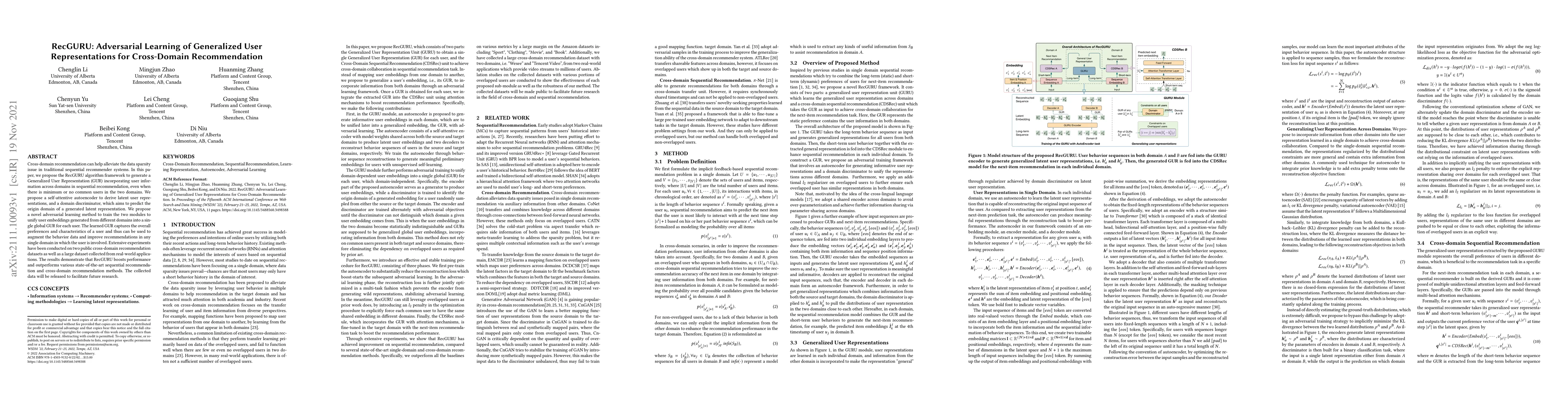 RecGURU proposes an adversarial learning framework to generate Generalized User Representations (GUR) for cross-domain recommendation, improving recommendation performance by unifying user embeddings across domains. Experiments show it outperforms state-of-the-art methods on both public and real-world datasets.