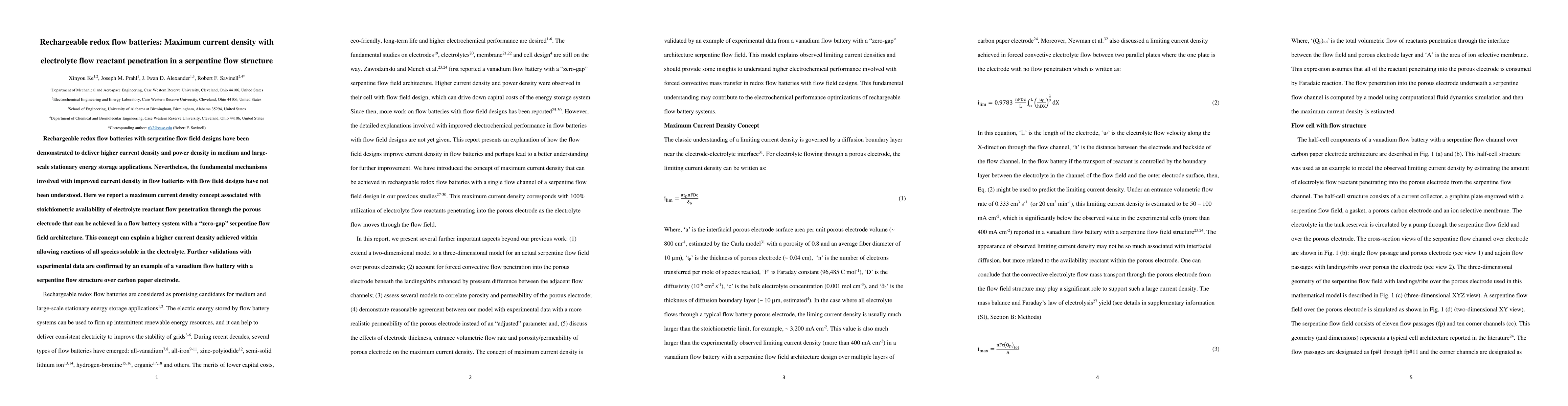 This paper explores the mechanisms behind higher current density in rechargeable redox flow batteries with serpentine flow fields, proposing a "maximum current density" concept linked to the stoichiometric availability of electrolyte reactant penetration in a "zero-gap" serpentine architecture. Experimental validation using a vanadium flow battery demonstrates the feasibility of this concept.
