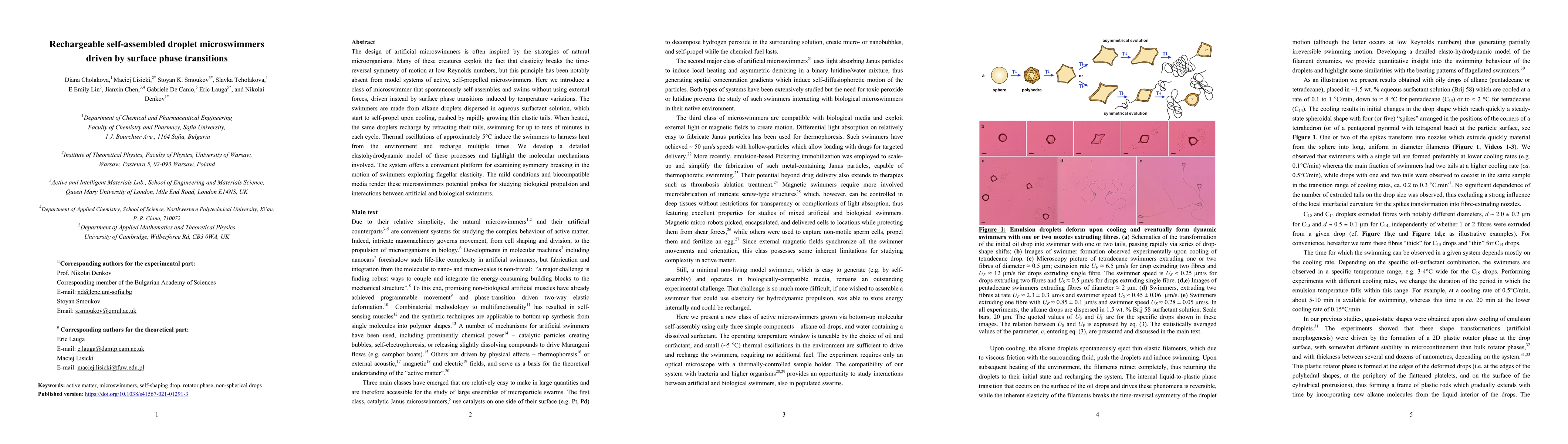 This paper presents self-assembled droplet microswimmers that propel themselves via temperature-induced surface phase transitions, driven by elastic tails that grow upon cooling and retract upon heating. The microswimmers, made from alkane droplets in aqueous surfactant solutions, can recharge and swim multiple times using thermal oscillations, offering a biocompatible platform for studying biological propulsion and interactions.