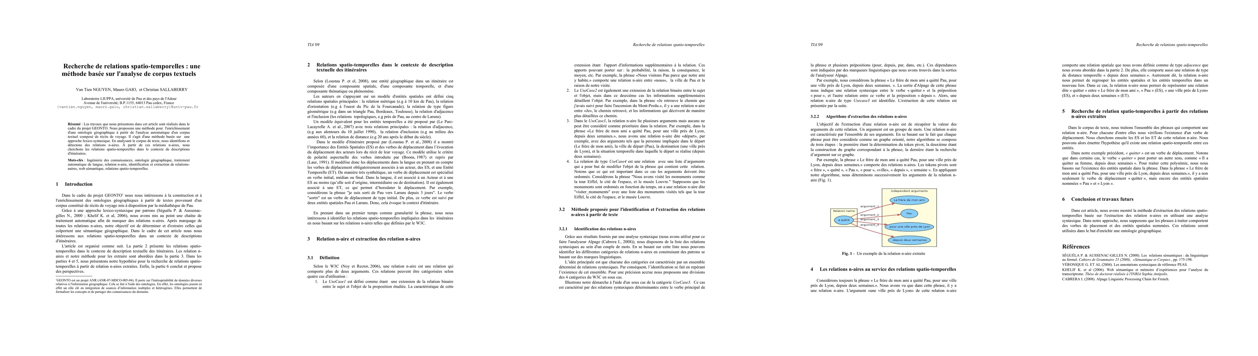 This paper presents a work package realized for the G\'eOnto project. A new method is proposed for an enrichment of a first geographical ontology developed beforehand. This method relies on text analysis by lexico-syntactic patterns. From the retrieve of n-ary relations the method automatically detect those involved in a spatial and/or temporal relation in a context of a description of journeys.