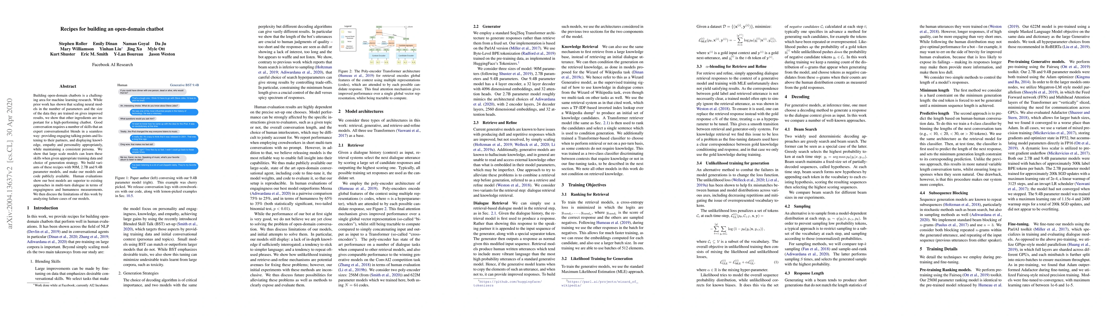 This paper outlines strategies for constructing high-performing open-domain chatbots, emphasizing the importance of training data and generation methods beyond just scaling neural models. The authors present models with varying sizes and demonstrate their superior engagement and humanness in multi-turn dialogues, while also discussing their limitations through failure case analysis.