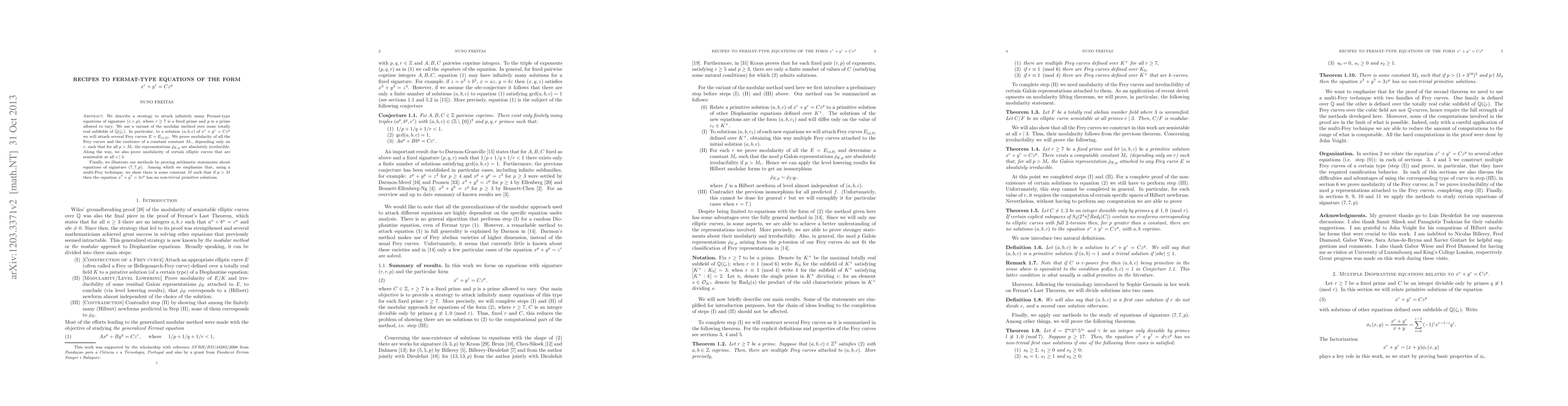 This paper develops a strategy to tackle Fermat-type equations of the form \(x^r + y^r = Cz^p\) for \(r \geq 7\) using modular methods over \(\mathbb{Q}(\zeta_r)\). It proves modularity of Frey curves associated with solutions and shows that for sufficiently large \(p\), certain representations are irreducible.