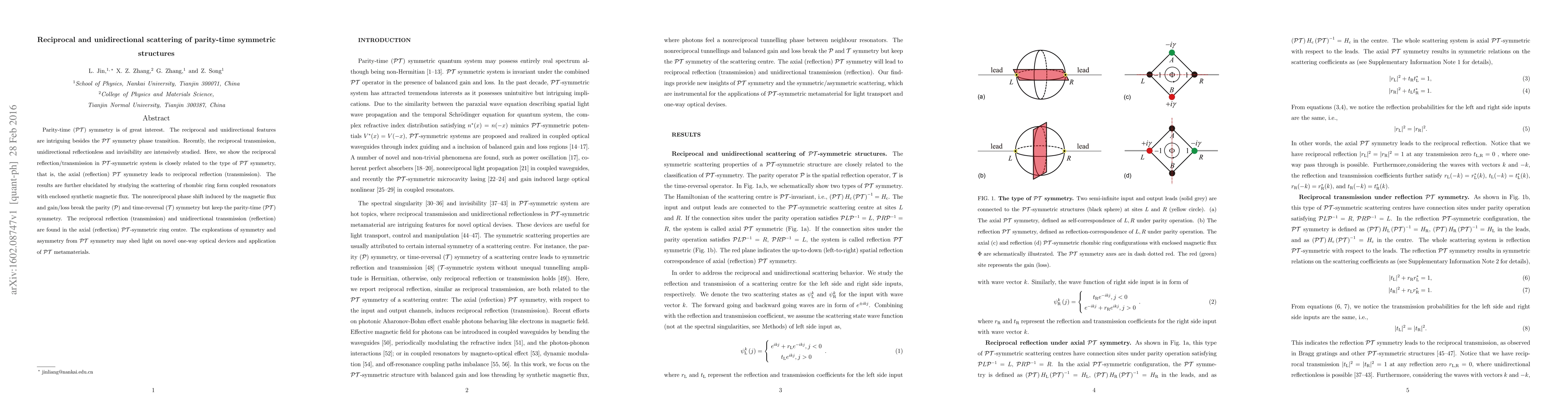 This paper explores the reciprocal and unidirectional scattering properties in parity-time (PT) symmetric structures, demonstrating that axial PT symmetry leads to reciprocal reflection/transmission. The study uses rhombic ring coupled resonators with synthetic magnetic flux to illustrate how PT symmetry can be maintained despite broken P and T symmetries, revealing potential for novel one-way optical devices.