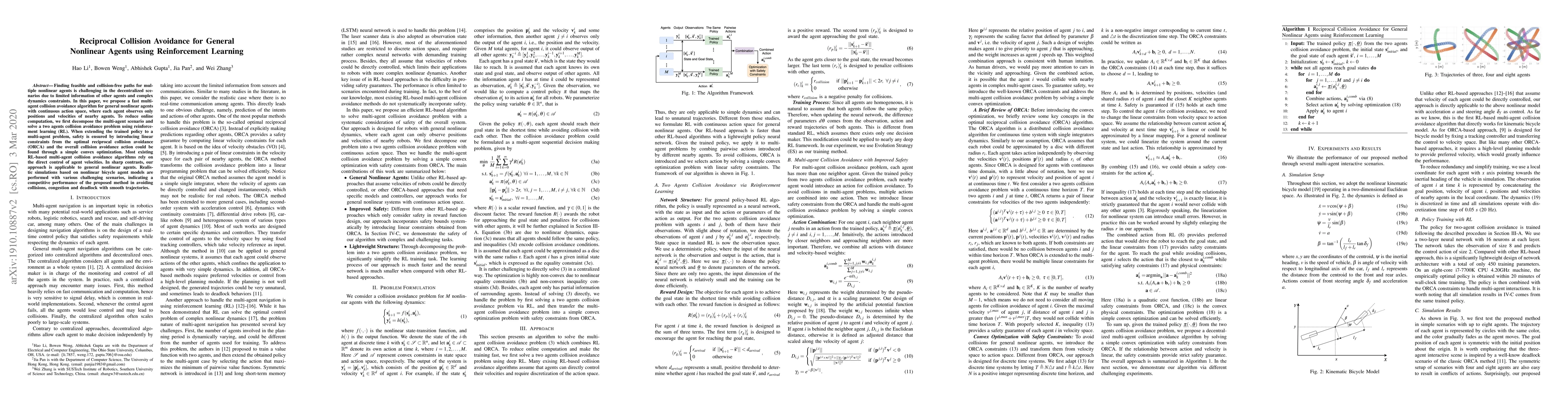 This paper proposes a reinforcement learning-based collision avoidance algorithm for nonlinear agents operating in decentralized environments. It uses a decomposed two-agent approach to train the policy, which is then extended to multi-agent scenarios with safety ensured by optimal reciprocal collision avoidance constraints and convex optimization.