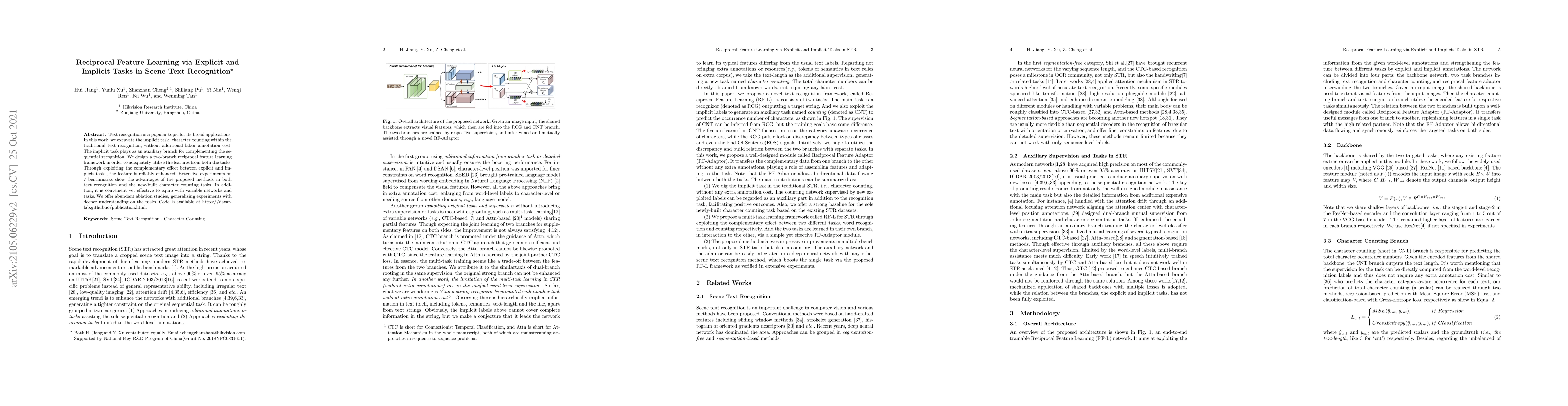 This paper proposes a two-branch reciprocal feature learning framework that leverages both explicit text recognition and implicit character counting tasks to enhance feature extraction. The framework effectively utilizes complementary information from both tasks, demonstrating improved performance on text recognition and character counting benchmarks.