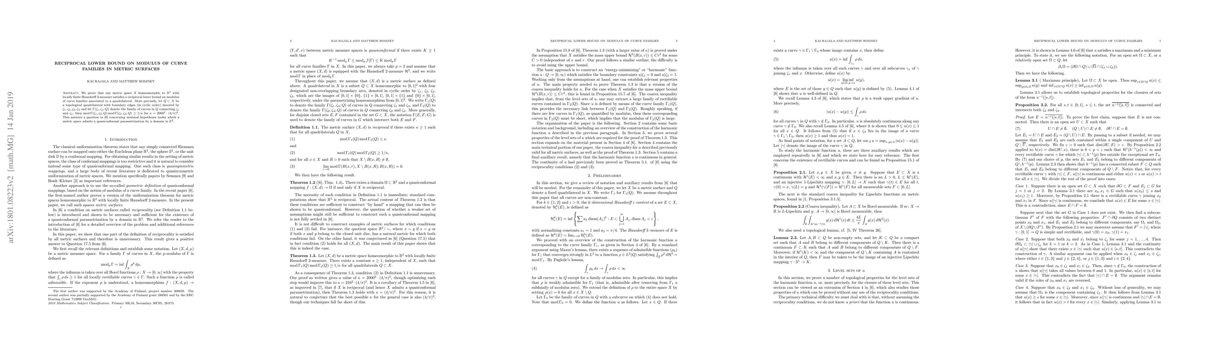 We prove that any metric space $X$ homeomorphic to $\mathbb{R}^2$ with locally finite Hausdorff 2-measure satisfies a reciprocal lower bound on modulus of curve families associated to a quadrilateral. More precisely, let $Q \subset X$ be a topological quadrilateral with boundary edges (in cyclic order) denoted by $\zeta_1, \zeta_2, \zeta_3, \zeta_4$ and let $\Gamma(\zeta_i, \zeta_j; Q)$ denote the family of curves in $Q$ connecting $\zeta_i$ and $\zeta_j$; then $\text{mod} \Gamma(\zeta_1, \zeta_3; Q) \text{mod} \Gamma(\zeta_2, \zeta_4; Q) \geq 1/\kappa$ for $\kappa = 2000^2\cdot (4/\pi)^2$. This answers a question concerning minimal hypotheses under which a metric space admits a quasiconformal parametrization by a domain in $\mathbb{R}^2$.