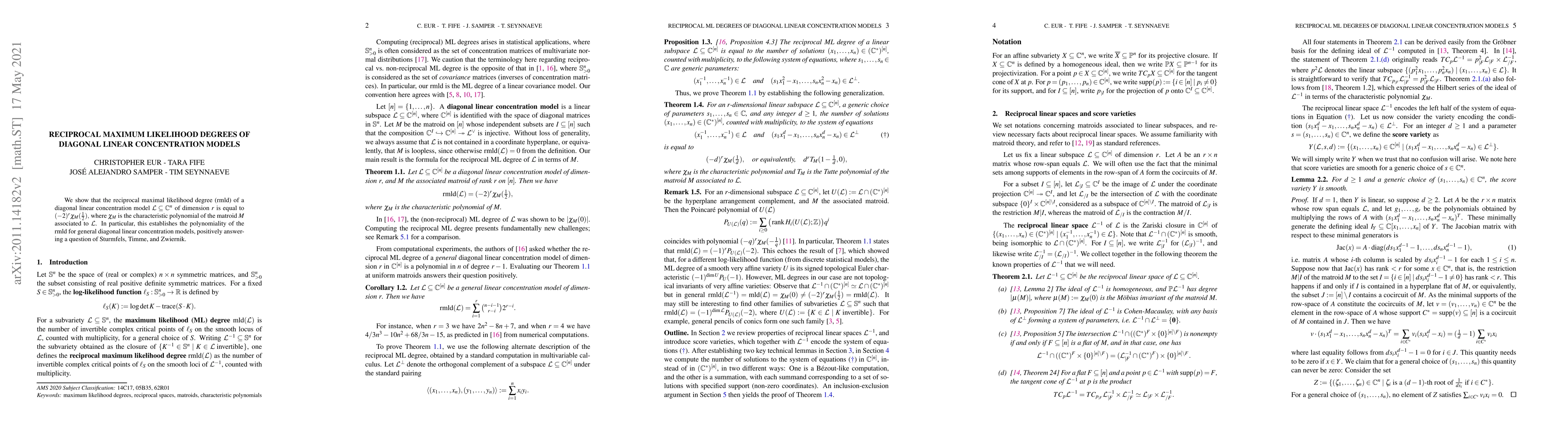 This paper establishes that the reciprocal maximal likelihood degree (rmld) for diagonal linear concentration models is $(-2)^r\chi_M(\frac{1}{2})$, where $\chi_M$ is the characteristic polynomial of the associated matroid, proving the polynomiality of rmld for these models. This answers a question posed by Sturmfels, Timme, and Zwiernik.