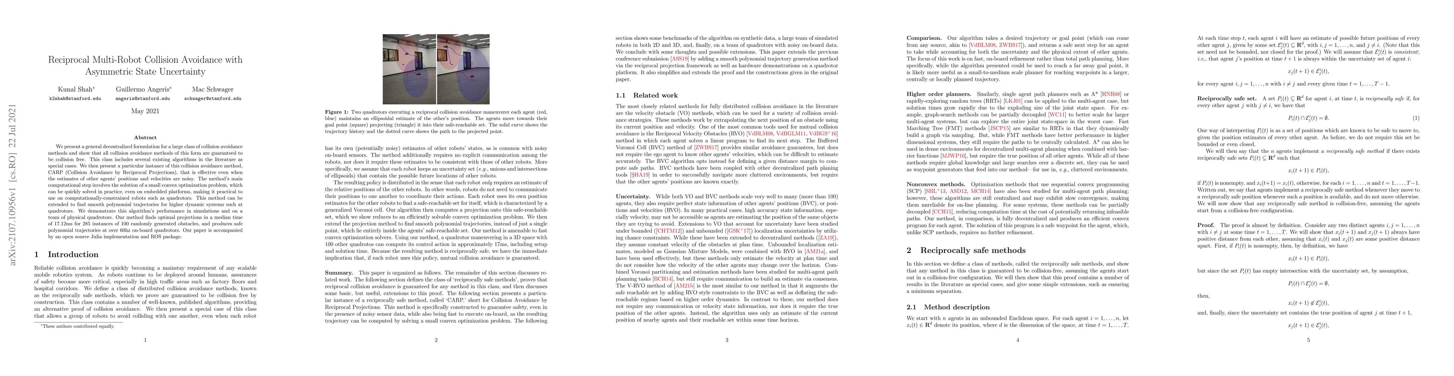 We present a general decentralized formulation for a large class of collision avoidance methods and show that all collision avoidance methods of this form are guaranteed to be collision free. This class includes several existing algorithms in the literature as special cases. We then present a particular instance of this collision avoidance method, CARP (Collision Avoidance by Reciprocal Projections), that is effective even when the estimates of other agents' positions and velocities are noisy. The method's main computational step involves the solution of a small convex optimization problem, which can be quickly solved in practice, even on embedded platforms, making it practical to use on computationally-constrained robots such as quadrotors. This method can be extended to find smooth polynomial trajectories for higher dynamic systems such at quadrotors. We demonstrate this algorithm's performance in simulations and on a team of physical quadrotors. Our method finds optimal projections in a median time of 17.12ms for 285 instances of 100 randomly generated obstacles, and produces safe polynomial trajectories at over 60hz on-board quadrotors. Our paper is accompanied by an open source Julia implementation and ROS package.