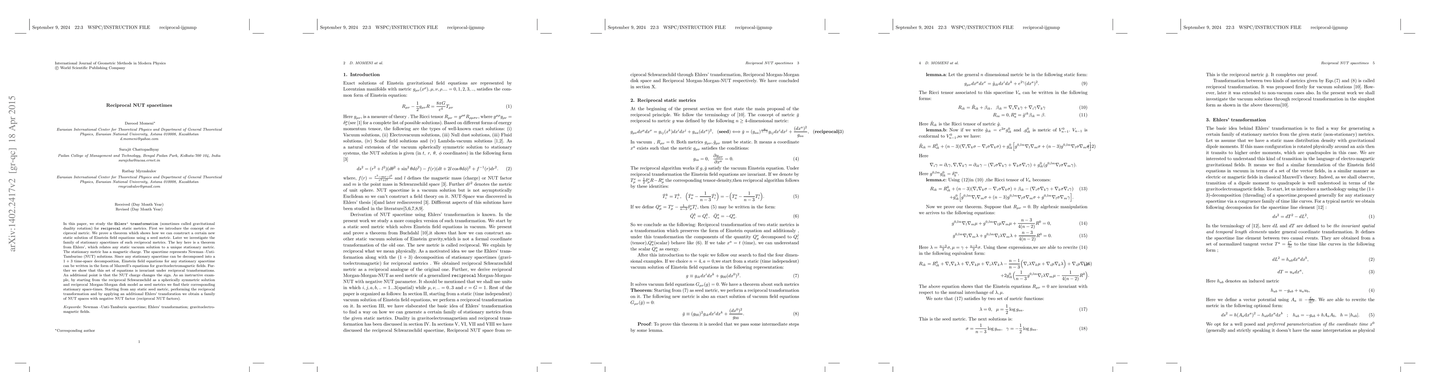 This paper explores the Ehlers' transformation for reciprocal static metrics, constructing new static solutions of Einstein's field equations using seed metrics. It investigates stationary spacetimes of reciprocal metrics, showing that they relate to Newman-Unti-Tamburino (NUT) solutions with a magnetic charge, and demonstrates that the NUT charge changes sign under reciprocal transformations.