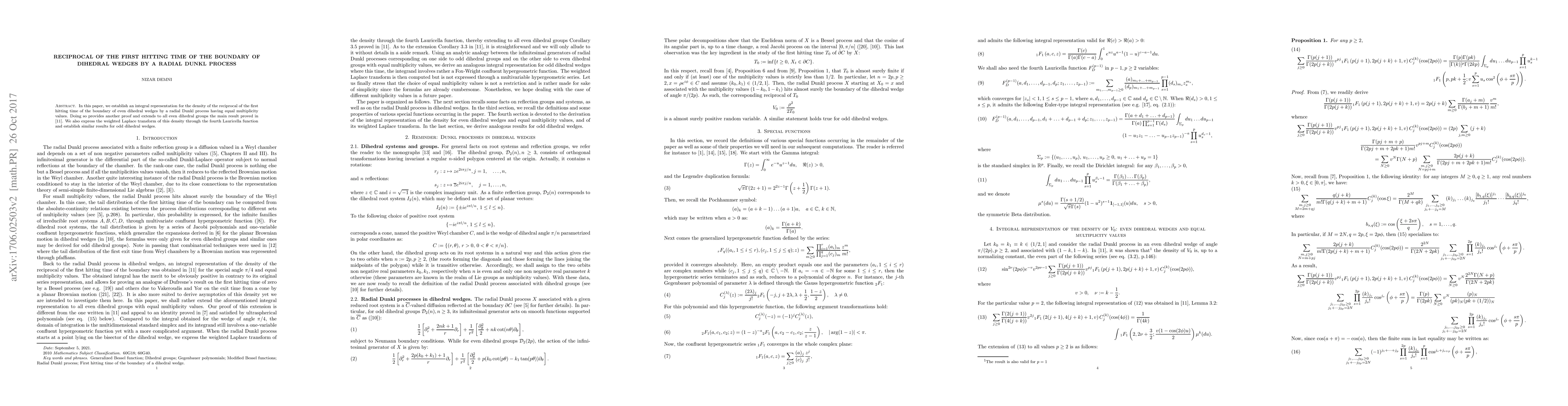 In this paper, we establish an integral representation for the density of the reciprocal of the first hitting time of the boundary of even dihedral wedges by a radial Dunkl process having equal multiplicity values. Doing so provides another proof and extends to all even dihedral groups the main result proved in \cite{Demni1}. We also express the weighted Laplace transform of this density through the fourth Lauricella Lauricella function and establish a similar integral representation for odd dihedral wedges.