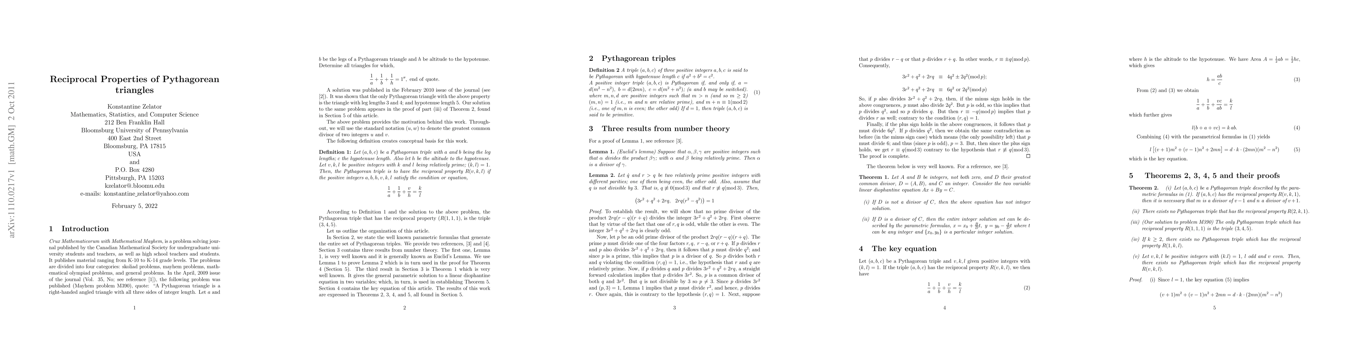Let (a,b,c)be a Pythagorean triple with c being the hypotenuse length, and h being the altitude to the hypotenuse. Also, let v,k,l be positive integers with k and l being relatively prime.We say(Definition1 in this work)that the Pythagorean triple (a,b,c) has the reciprocal property R(v,k,l)if the positive integers a,b,c,v,k,and l satisfy the condition or equation, 1/a+1/b+v/h = k/l. The motivating force behind this work, is a problem that appeared in the journal, Crux Mathematicorum with Mathematical Mayhem. The said problem is Mayhem problem M390, and it appeared in the April2009 issue of the journal(see reference {1}). A solution to the same problem was published in the February 2010 issue(see {2}).Using the above definition, the probem can be stated as follows:Find all the Pythagorean triples that have the reciprocal property R(1,1,1). It turns out that the only such triple is (3,4,5).Our solution to this problem is found in Theorem2, part(iii).The results of this paper are expressed in Theorems2,3,4 and 5. Theorem2 contains five parts.Part(ii) states that there exists no Pythagorean triple which has the reciprocal property R(2,k,1). Part(iv) says that if k is at least2; then there exists no Pythagorean triple that has the reciprocal property R(1,k,l). Theorem3 states that if the positive integer v is such that the integers v-1 and v+1 are twin primes; then there is no Pythagorean triple that has the reciprocal property R(v,k,1).