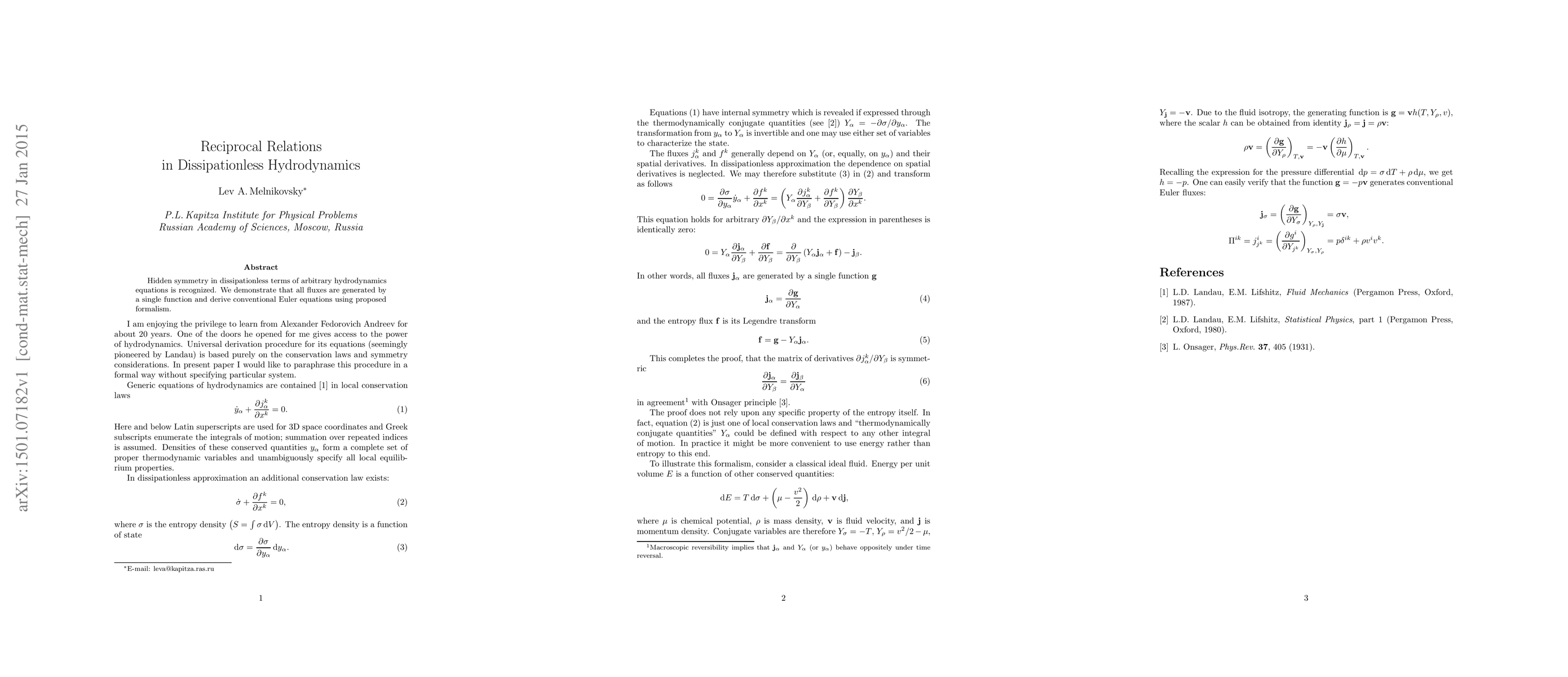 This paper uncovers hidden symmetry in dissipationless hydrodynamics, showing that all fluxes can be derived from a single function. It successfully derives conventional Euler equations through the proposed formalism.