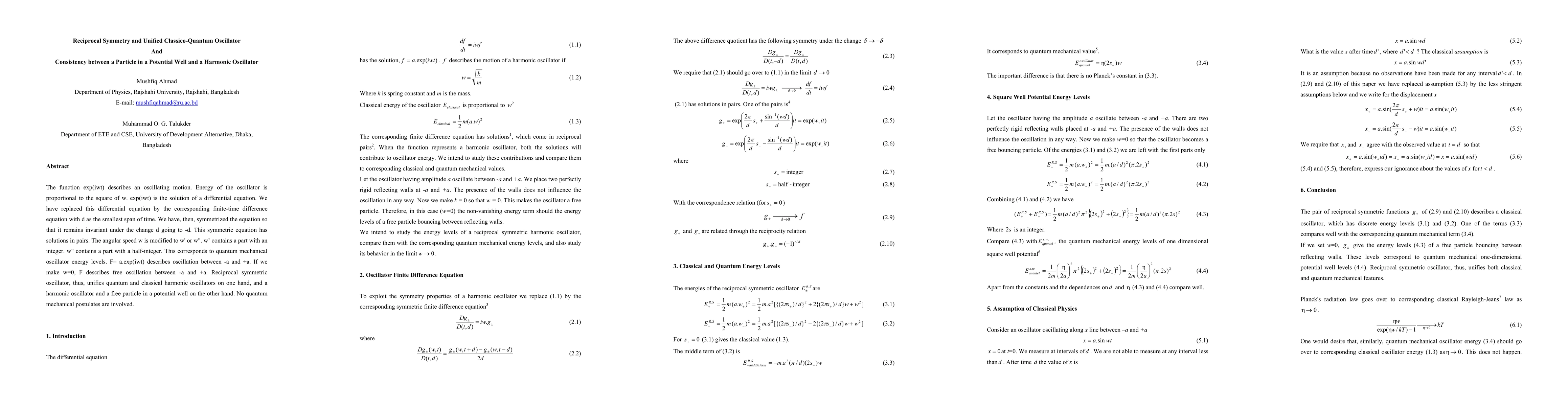The function exp(iwt) describes an oscillating motion. Energy of the oscillator is proportional to the square of w. exp(iwt) is the solution of a differential equation. We have replaced this differential equation by the corresponding finite-time difference equation with d as the smallest span of time. We have, then, symmetrized the equation so that it remains invariant under the change d going to -d. This symmetric equation has solutions in pairs. The angular speed w is modified to w' or w". w' contains a part with an integer. w" contains a part with a half-integer. This corresponds to quantum mechanical oscillator energy levels. F= a.exp(iwt) describes oscillation between -a and +a. If we make w=0, F describes free oscillation between -a and +a. Reciprocal symmetric oscillator, thus, unifies quantum and classical harmonic oscillators on one hand, and a harmonic oscillator and a free particle in a potential well on the other hand. No quantum mechanical postulates are involved.