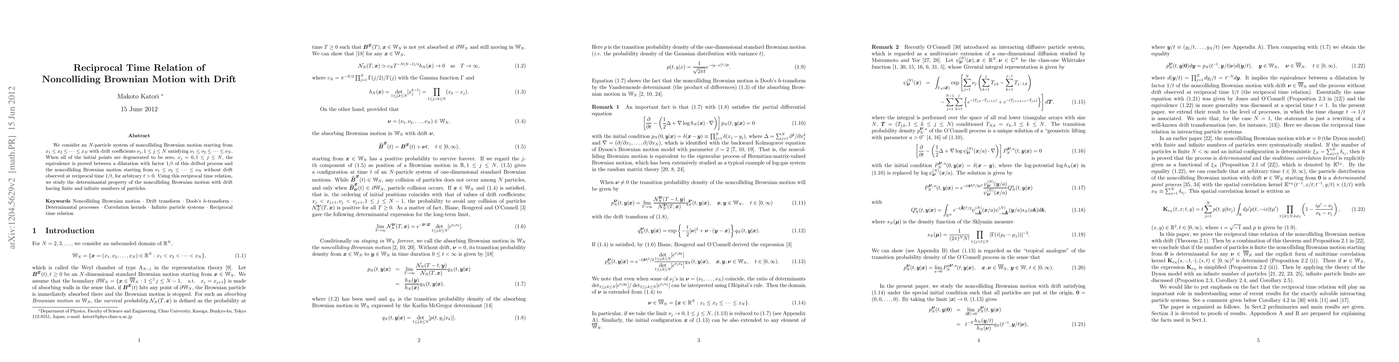 This paper explores the equivalence between a scaled drifted Brownian motion process and noncolliding Brownian motion without drift observed at reciprocal time, proving a determinantal property for both finite and infinite particle systems. The study leverages the reciprocal time relation to analyze the dynamics of noncolliding Brownian motion with drift.