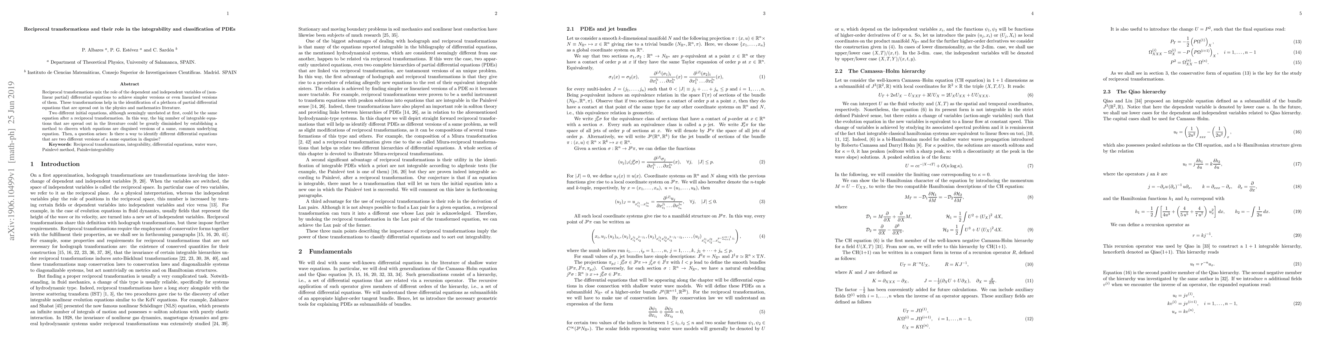 This paper explores how reciprocal transformations can simplify partial differential equations, helping to identify common underlying equations and classify them.