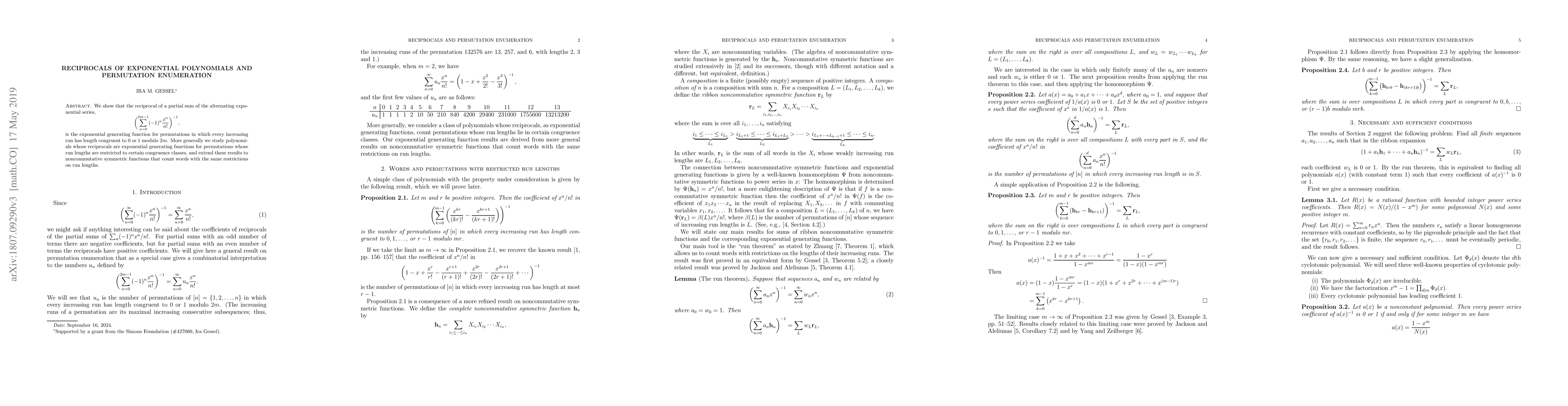 We show that the reciprocal of a partial sum with 2m terms of the alternating exponential series is the exponential generating function for permutations in which every increasing run has length congruent to 0 or 1 modulo 2m. More generally we study polynomials whose reciprocals are exponential generating functions for permutations whose run lengths are restricted to certain congruence classes, and extend these results to noncommutative symmetric functions that count words with the same restrictions on run lengths.