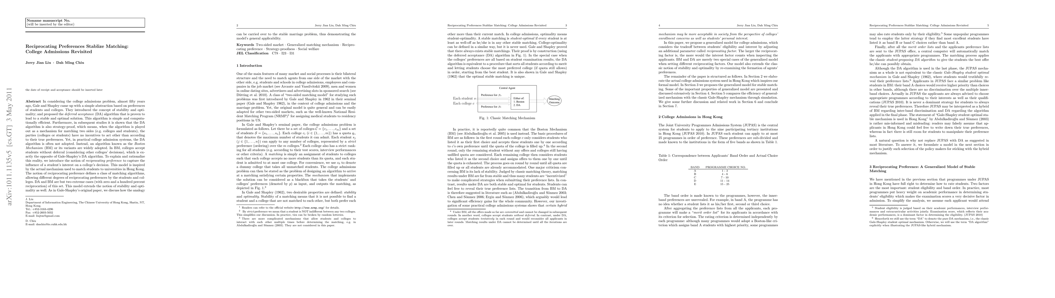 In considering the college admissions problem, almost fifty years ago, Gale and Shapley came up with a simple abstraction based on preferences of students and colleges. They introduced the concept of stability and optimality; and proposed the deferred acceptance (DA) algorithm that is proven to lead to a stable and optimal solution. This algorithm is simple and computationally efficient. Furthermore, in subsequent studies it is shown that the DA algorithm is also strategy-proof, which means, when the algorithm is played out as a mechanism for matching two sides (e.g. colleges and students), the parties (colleges or students) have no incentives to act other than according to their true preferences. Yet, in practical college admission systems, the DA algorithm is often not adopted. Instead, an algorithm known as the Boston Mechanism (BM) or its variants are widely adopted. In BM, colleges accept students without deferral (considering other colleges' decisions), which is exactly the opposite of Gale-Shapley's DA algorithm. To explain and rationalize this reality, we introduce the notion of reciprocating preference to capture the influence of a student's interest on a college's decision. This model is inspired by the actual mechanism used to match students to universities in Hong Kong. The notion of reciprocating preference defines a class of matching algorithms, allowing different degrees of reciprocating preferences by the students and colleges. DA and BM are but two extreme cases (with zero and a hundred percent reciprocation) of this set. This model extends the notion of stability and optimality as well. As in Gale-Shapley's original paper, we discuss how the analogy can be carried over to the stable marriage problem, thus demonstrating the model's general applicability.