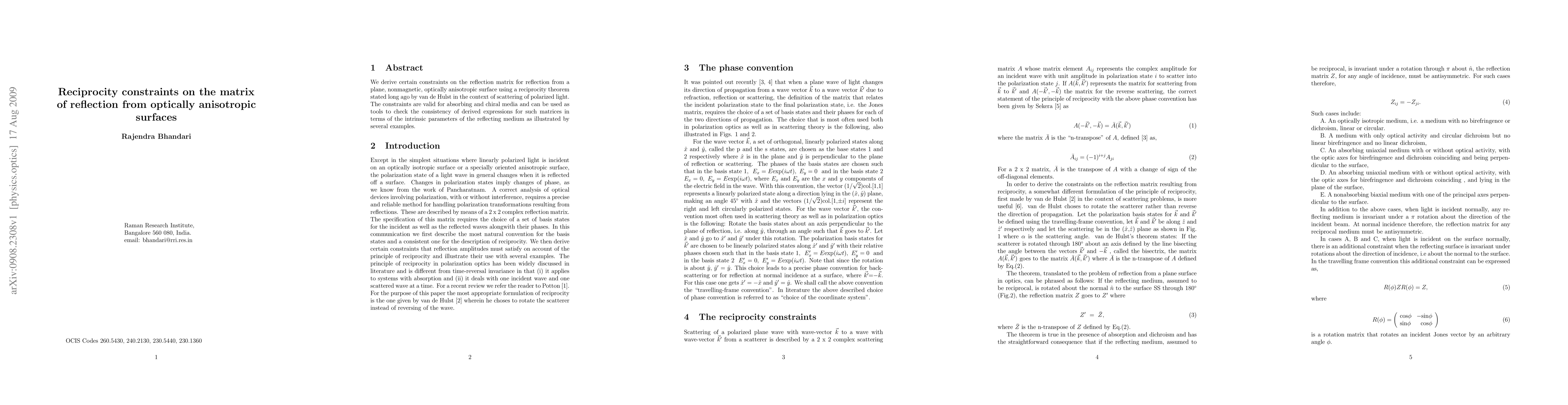 We derive certain constraints on the reflection matrix for reflection from a plane, nonmagnetic, optically anisotropic surface using a reciprocity theorem stated long ago by van de Hulst in the context of scattering of polarized light. The constraints are valid for absorbing and chiral media and can be used as tools to check the consistency of derived expressions for such matrices in terms of the intrinsic parameters of the reflecting medium as illustrated by several examples.
