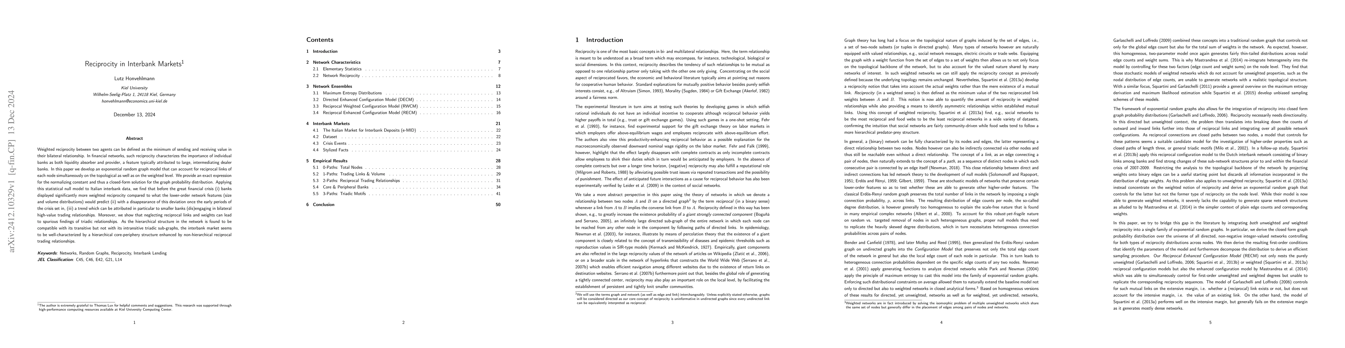 This paper develops an exponential random graph model to analyze weighted reciprocity in Italian interbank markets, revealing that pre-crisis banks exhibited higher-than-expected reciprocity, especially among smaller banks, which normalized during the early crisis period. The study highlights the importance of considering reciprocal links and weights to avoid spurious findings in network analysis.