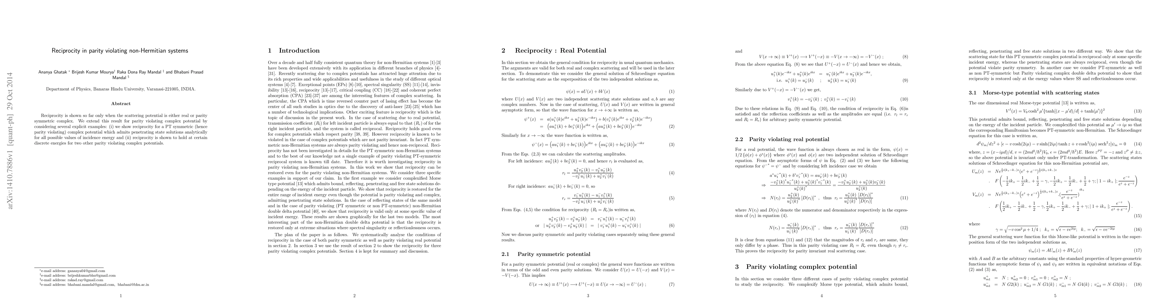 Reciprocity is shown so far only when the scattering potential is either real or parity symmetric complex. We extend this result for parity violating complex potential by considering several explicit examples: (i) we show reciprocity for a PT symmetric (hence parity violating) complex potential which admits penetrating state solutions analytically for all possible values of incidence energy and (ii) reciprocity is shown to hold at certain discrete energies for two other parity violating complex potentials.