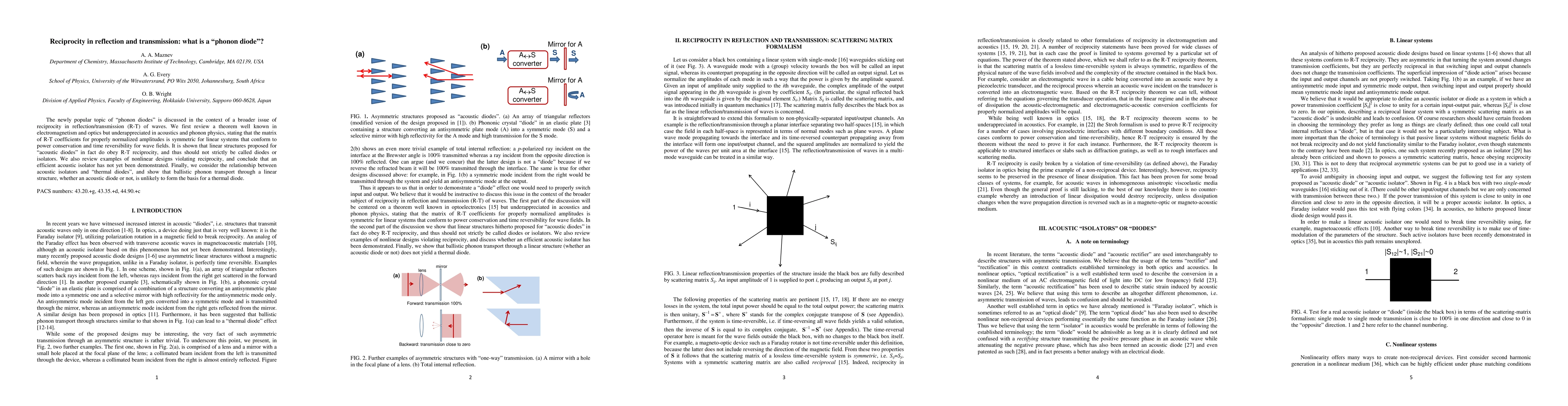 The newly popular topic of "phonon diodes" is discussed in the context of a broader issue of reciprocity in reflection/transmission (R-T) of waves. We first review a theorem well known in electromagnetism and optics but underappreciated in acoustics and phonon physics, stating that the matrix of R-T coefficients for properly normalized amplitudes is symmetric for linear systems that conform to power conservation and time reversibility for wave fields. It is shown that linear structures proposed for "acoustic diodes" in fact do obey R-T reciprocity, and thus should not strictly be called diodes or isolators. We also review examples of nonlinear designs violating reciprocity, and conclude that an efficient acoustic isolator has not yet been demonstrated. Finally, we consider the relationship between acoustic isolators and "thermal diodes", and show that ballistic phonon transport through a linear structure, whether an acoustic diode or not, is unlikely to form the basis for a thermal diode.