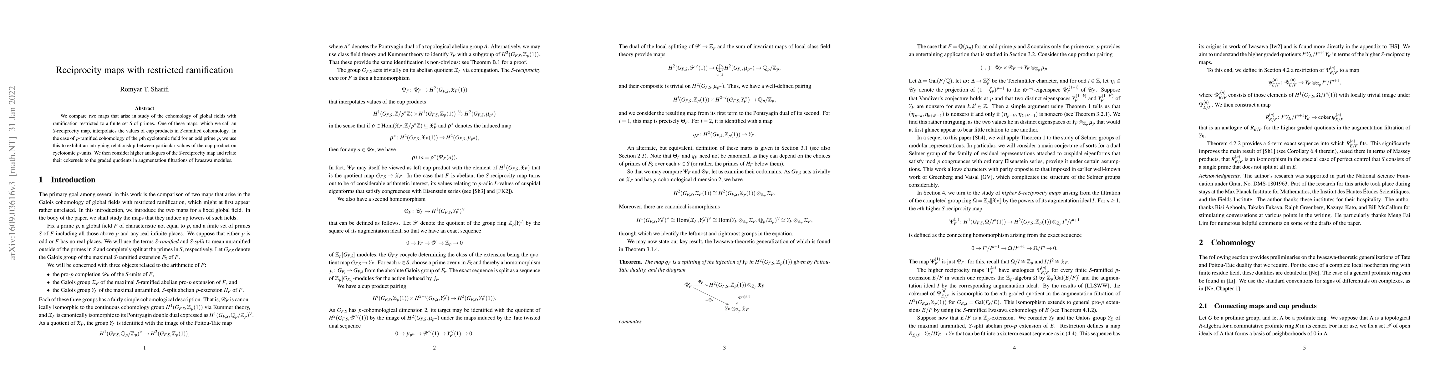We compare two maps that arise in study of the cohomology of number fields with ramification restricted to a finite set S of primes. One of these maps, which we call an S-reciprocity map, interpolates the values of cup products in S-ramified cohomology. In the case of p-ramified cohomology of the pth cyclotomic field for an odd prime p, we use this to exhibit an intriguing relationship between particular values of the cup product on cyclotomic p-units. We then consider higher analogues of the S-reciprocity map and relate their cokernels to the graded quotients in augmentation filtrations of Iwasawa modules.