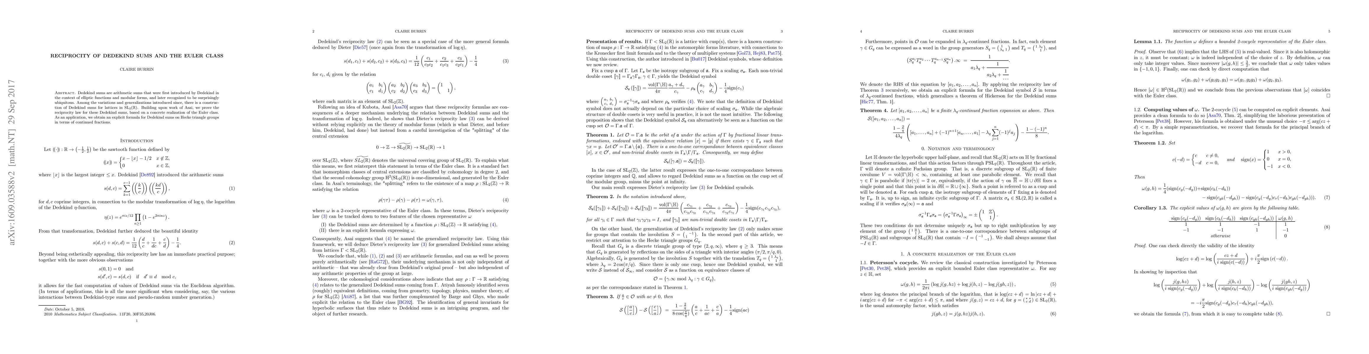 This paper proves the reciprocity law for Dedekind sums associated with lattices in $\mathrm{SL}_2(\mathbf{R})$ using the Euler class, and derives an explicit formula for these sums in terms of continued fractions for Hecke triangle groups.