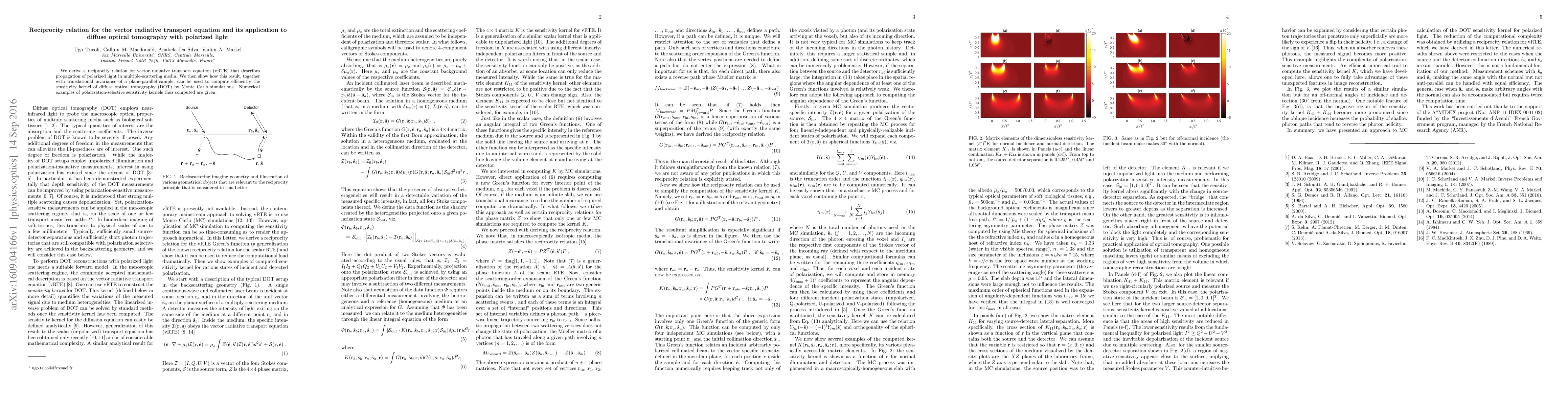Summary: This paper derives a reciprocity relation for the vector radiative transport equation to describe polarized light propagation in scattering media and demonstrates its application in efficiently computing sensitivity kernels for diffuse optical tomography using Monte Carlo simulations. Numerical examples illustrate polarization-selective sensitivity kernels.