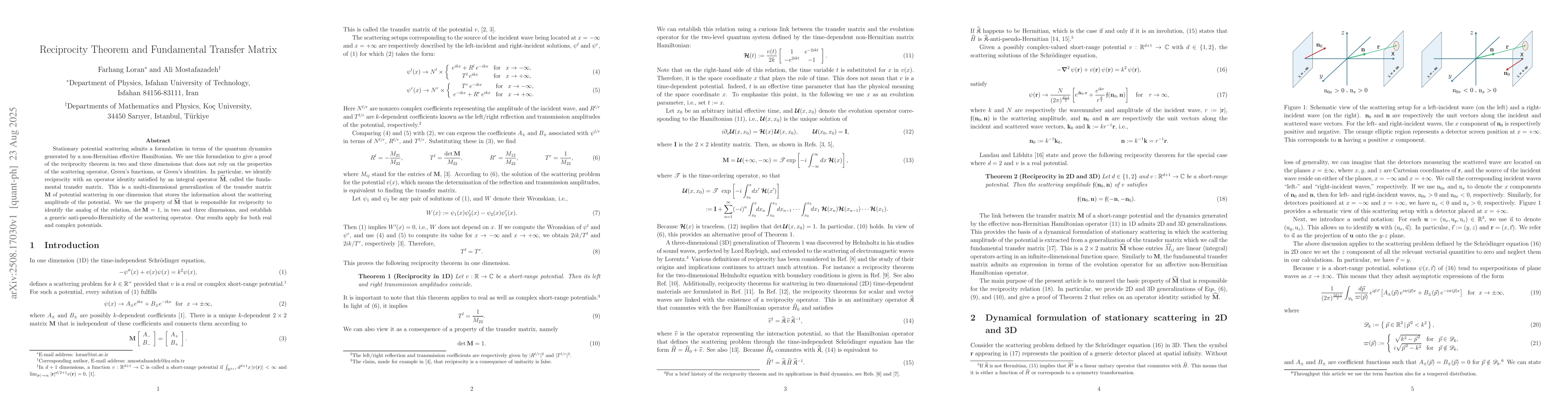 Stationary potential scattering admits a formulation in terms of the quantum dynamics generated by a non-Hermitian effective Hamiltonian. We use this formulation to give a proof of the reciprocity theorem in two and three dimensions that does not rely on the properties of the scattering operator, Green's functions, or Green's identities. In particular, we identify reciprocity with an operator identity satisfied by an integral operator $\widehat{\mathbf{M}}$, called the fundamental transfer matrix. This is a multi-dimensional generalization of the transfer matrix $\mathbf{M}$ of potential scattering in one dimension that stores the information about the scattering amplitude of the potential. We use the property of $\widehat{\mathbf{M}}$ that is responsible for reciprocity to identify the analog of the relation, $\det{\mathbf{M}}=1$, in two and three dimensions, and establish a generic anti-pseudo-Hermiticity of the scattering operator. Our results apply for both real and complex potentials.