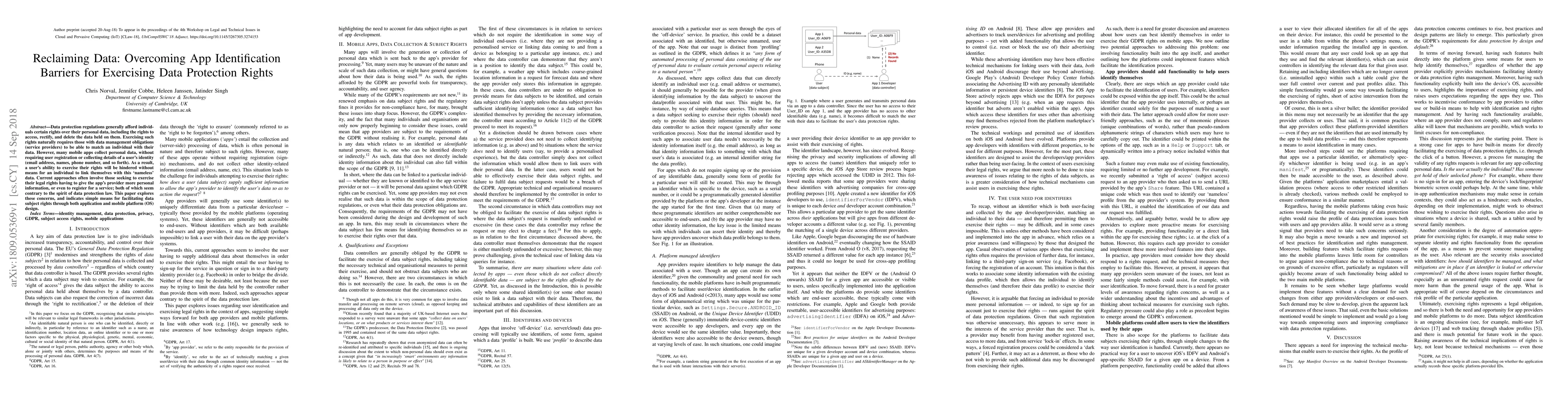 This paper investigates barriers to exercising data protection rights in mobile apps that do not require user registration, proposing simple design solutions within applications and mobile platforms to help users link their identities to their data without compromising privacy.