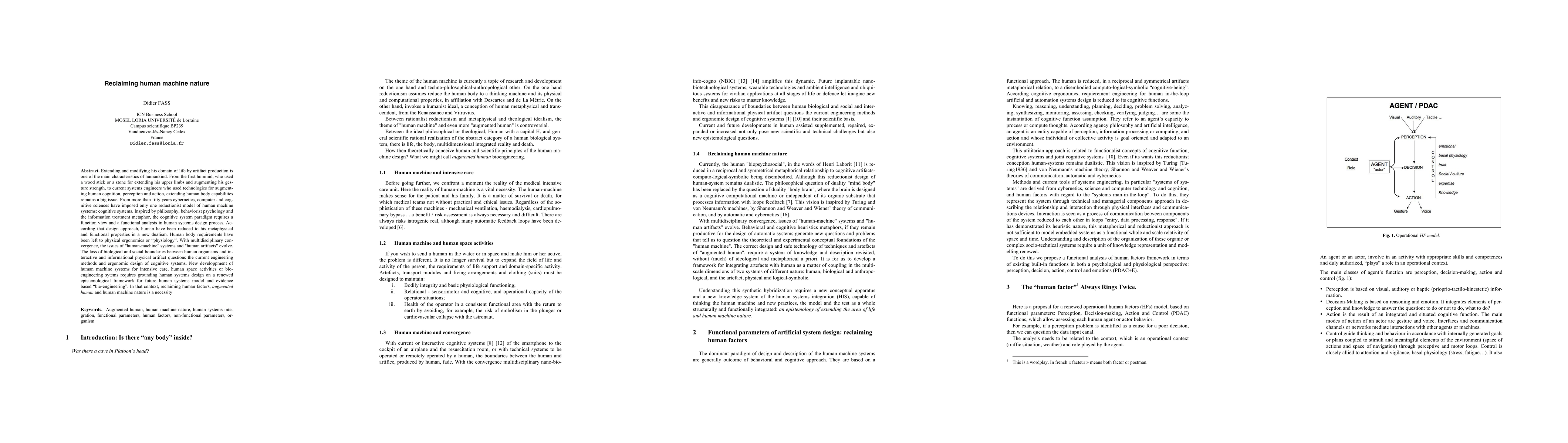 Extending and modifying his domain of life by artifact production is one of the main characteristics of humankind. From the first hominid, who used a wood stick or a stone for extending his upper limbs and augmenting his gesture strength, to current systems engineers who used technologies for augmenting human cognition, perception and action, extending human body capabilities remains a big issue. From more than fifty years cybernetics, computer and cognitive sciences have imposed only one reductionist model of human machine systems: cognitive systems. Inspired by philosophy, behaviorist psychology and the information treatment metaphor, the cognitive system paradigm requires a function view and a functional analysis in human systems design process. According that design approach, human have been reduced to his metaphysical and functional properties in a new dualism. Human body requirements have been left to physical ergonomics or "physiology". With multidisciplinary convergence, the issues of "human-machine" systems and "human artifacts" evolve. The loss of biological and social boundaries between human organisms and interactive and informational physical artifact questions the current engineering methods and ergonomic design of cognitive systems. New developpment of human machine systems for intensive care, human space activities or bio-engineering sytems requires grounding human systems design on a renewed epistemological framework for future human systems model and evidence based "bio-engineering". In that context, reclaiming human factors, augmented human and human machine nature is a necessity
