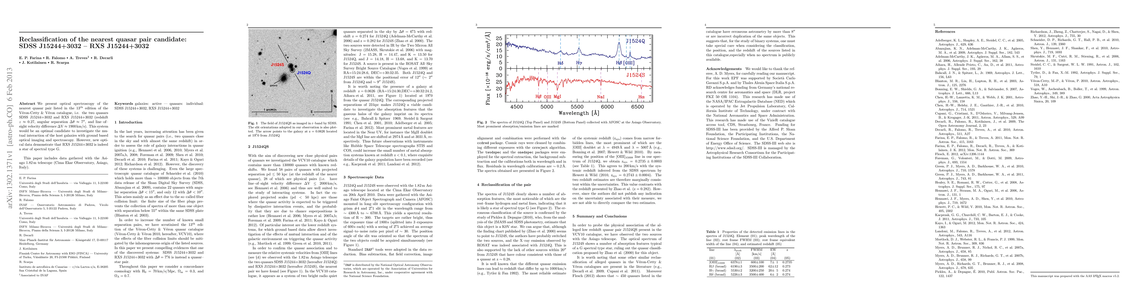 This study reevaluates the nearest quasar pair candidate, SDSS J15244+3032 and RXS J15244+3032, finding RXS J15244+3032 to be a star of spectral type G, not a quasar as previously listed, based on new optical data from the Asiago 1.82m telescope.