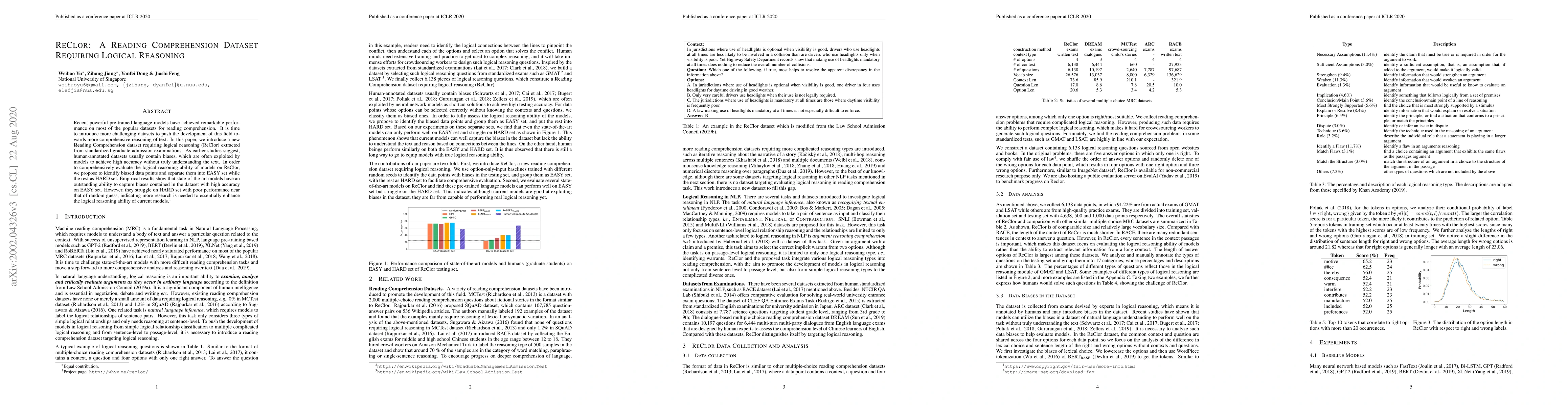 This paper introduces ReClor, a new reading comprehension dataset requiring logical reasoning, extracted from standardized graduate admission exams. The dataset is divided into EASY and HARD sets to evaluate model biases, revealing that while models excel on EASY, they struggle on HARD, indicating a need for improved logical reasoning in language models.