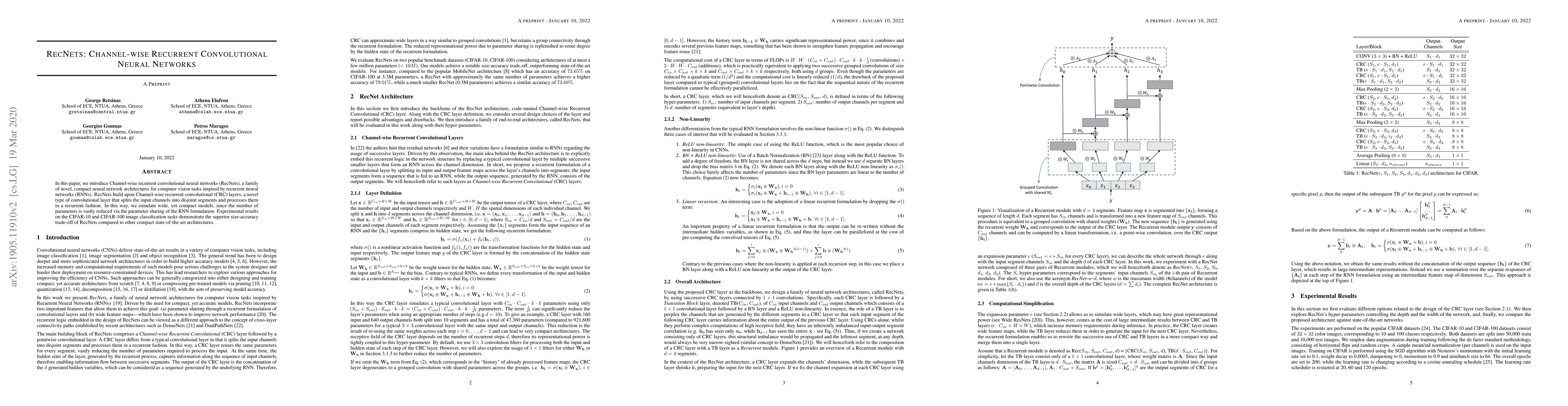 RecNets introduce channel-wise recurrent convolutional layers to create compact neural networks for computer vision, achieving a superior size-accuracy trade-off over other architectures in image classification tasks like CIFAR-10 and CIFAR-100.