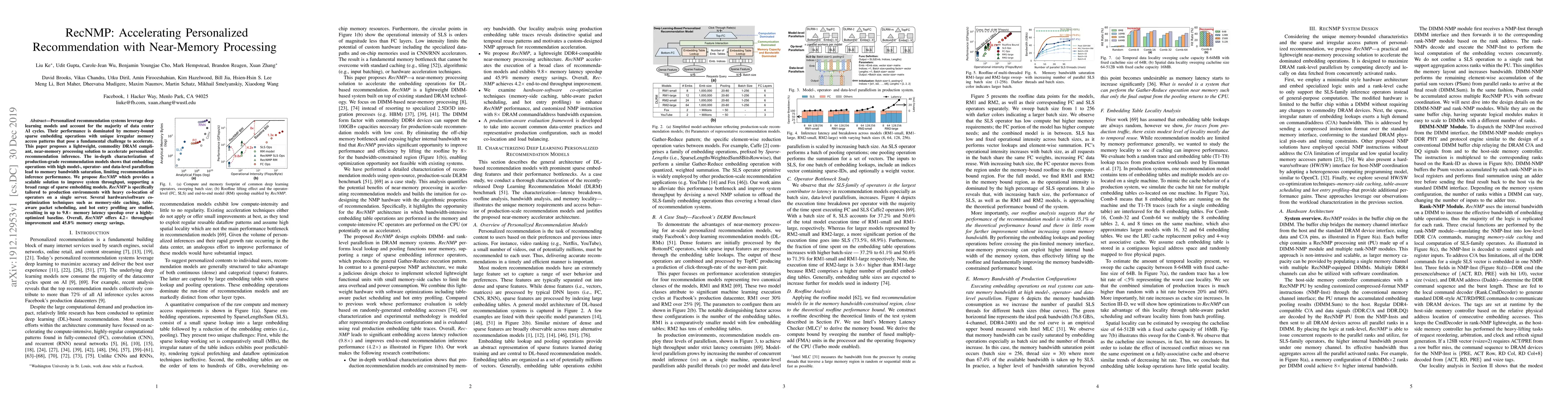 This paper introduces RecNMP, a near-memory processing solution designed to accelerate personalized recommendation systems by addressing memory bandwidth saturation. RecNMP employs hardware/software co-optimization techniques to achieve up to 9.8x memory latency speedup, resulting in 4.2x throughput improvement and 45.8% memory energy savings.