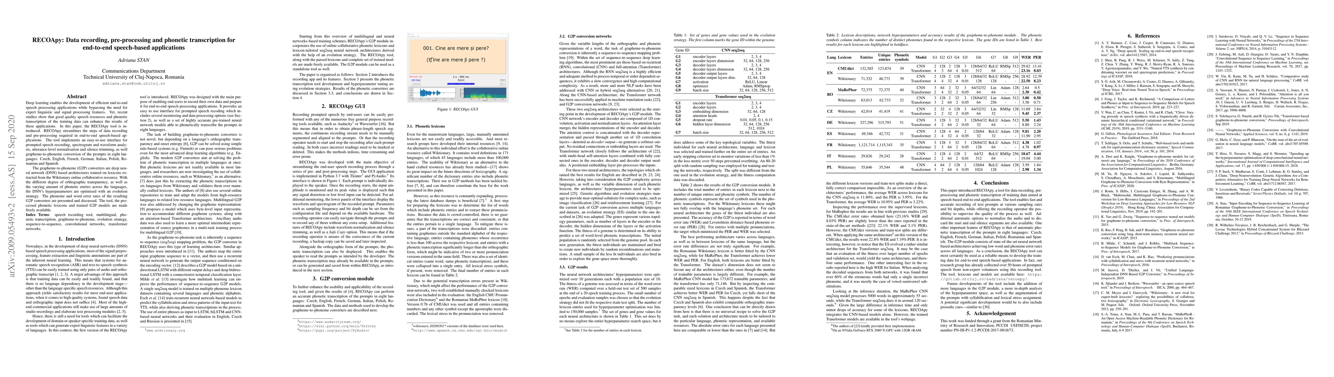 RECOApy is a tool designed to streamline the data recording, pre-processing, and phonetic transcription for end-to-end speech-based applications, featuring grapheme-to-phoneme conversion in eight languages using DNN-based models optimized for different linguistic properties. The tool is freely available along with its phonetic lexicons and trained models.