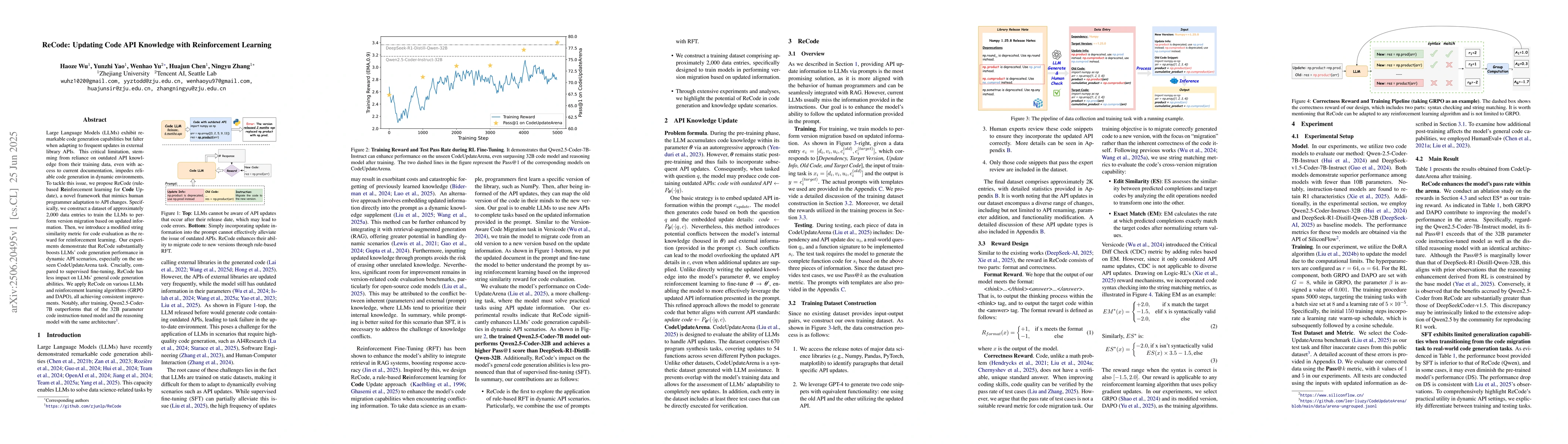 Large Language Models (LLMs) exhibit remarkable code generation capabilities but falter when adapting to frequent updates in external library APIs. This critical limitation, stemming from reliance on outdated API knowledge from their training data, even with access to current documentation, impedes reliable code generation in dynamic environments. To tackle this issue, we propose ReCode (rule-based Reinforcement learning for Code Update), a novel framework that mimics human programmer adaptation to API changes. Specifically, we construct a dataset of approximately 2,000 data entries to train the LLMs to perform version migration based on updated information. Then, we introduce a modified string similarity metric for code evaluation as the reward for reinforcement learning. Our experiments demonstrate that ReCode substantially boosts LLMs' code generation performance in dynamic API scenarios, especially on the unseen CodeUpdateArena task. Crucially, compared to supervised fine-tuning, ReCode has less impact on LLMs' general code generation abilities. We apply ReCode on various LLMs and reinforcement learning algorithms (GRPO and DAPO), all achieving consistent improvements. Notably, after training, Qwen2.5-Coder-7B outperforms that of the 32B parameter code instruction-tuned model and the reasoning model with the same architecture. Code is available at https://github.com/zjunlp/ReCode.
