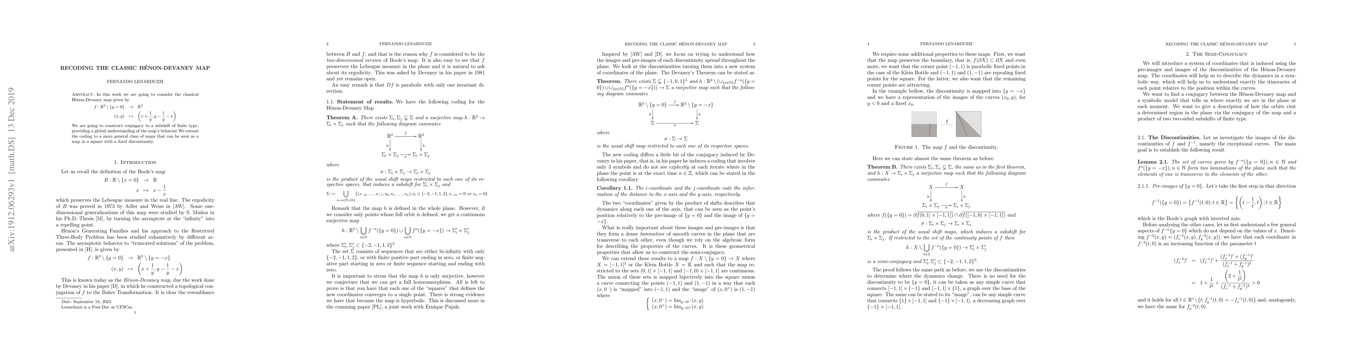 In this work we are going to consider the classical H\'enon-Devaney map given by \begin{eqnarray*} f: \mathbb{R}^2\setminus \{y=0\} &\rightarrow& \mathbb{R}^2 \\ (x,y) &\mapsto& \left(x+\dfrac{1}{y}, y-\dfrac{1}{y}-x\right) \end{eqnarray*} We are going to construct conjugacy to a subshift of finite type, providing a global understanding of the map's behavior.We extend the coding to a more general class of maps that can be seen as a map in a square with a fixed discontinuity.