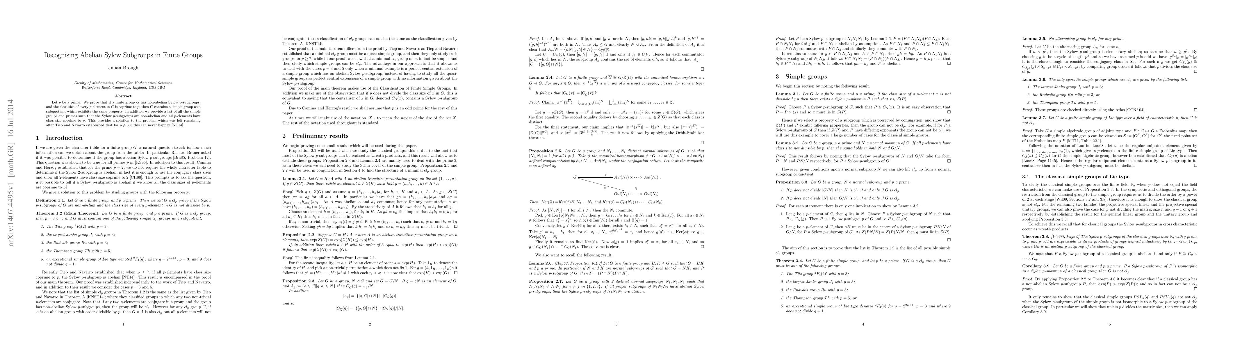 Let p be a prime. We prove that if a finite group G has non-abelian Sylow p-subgroups, and the class size of every p-element in G is coprime to p; then G contains a simple group as a subquotient which exhibits the same property. In addition we provide a list of all the simple groups and primes such that the Sylow p-subgroups are non-abelian and all p-elements have class size coprime to p. This provides a solution to the problem which was left remaining after Tiep and Navarro established that is p is not equal to 3 or 5, then this can never happen [NT14].