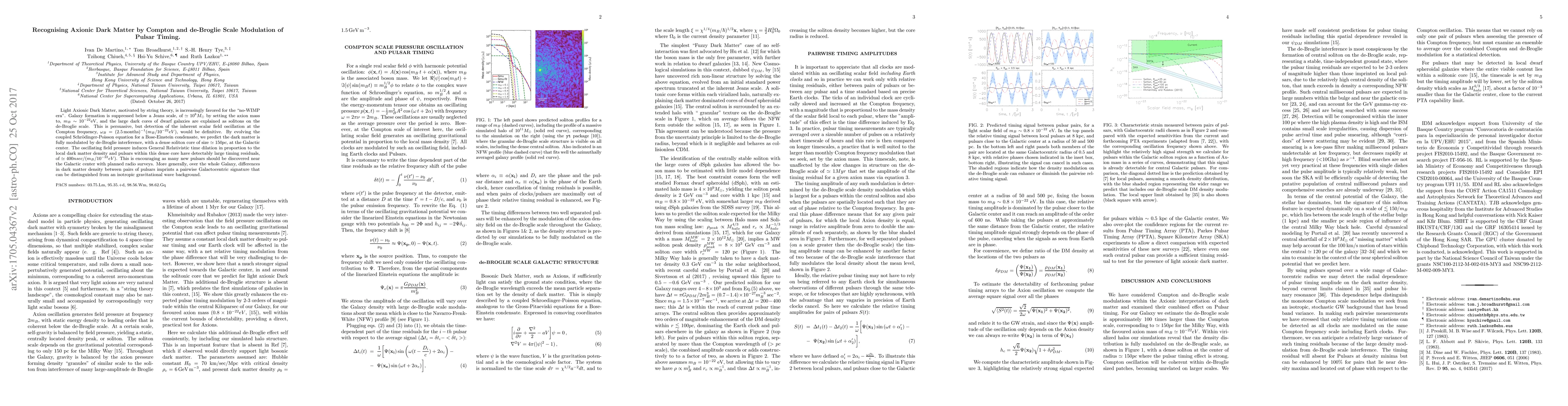 Light Axionic Dark Matter, motivated by string theory, is increasingly favored for the "no-WIMP era". Galaxy formation is suppressed below a Jeans scale, of $\simeq 10^8 M_\odot$ by setting the axion mass to, $m_B \sim 10^{-22}$eV, and the large dark cores of dwarf galaxies are explained as solitons on the de-Broglie scale. This is persuasive, but detection of the inherent scalar field oscillation at the Compton frequency, $\omega_B= (2.5{\rm \, months})^{-1}(m_B/10^{-22}eV)$, would be definitive. By evolving the coupled Schr\"odinger-Poisson equation for a Bose-Einstein condensate, we predict the dark matter is fully modulated by de-Broglie interference, with a dense soliton core of size $\simeq 150pc$, at the Galactic center. The oscillating field pressure induces General Relativistic time dilation in proportion to the local dark matter density and pulsars within this dense core have detectably large timing residuals, of $\simeq 400nsec/(m_B/10^{-22}eV)$. This is encouraging as many new pulsars should be discovered near the Galactic center with planned radio surveys. More generally, over the whole Galaxy, differences in dark matter density between pairs of pulsars imprints a pairwise Galactocentric signature that can be distinguished from an isotropic gravitational wave background.