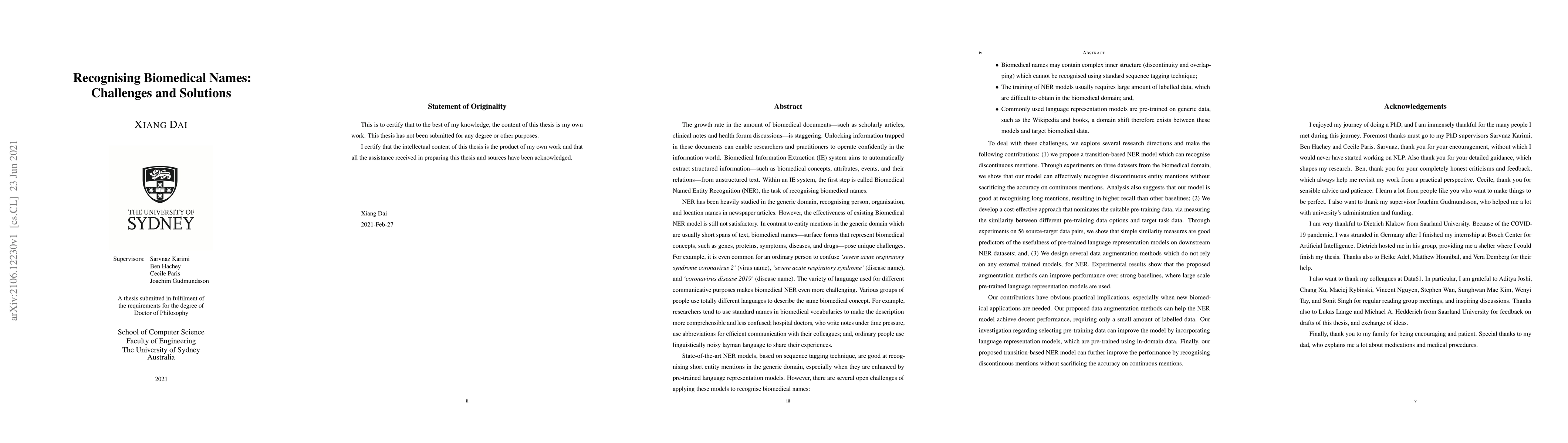 This paper addresses challenges in recognizing biomedical names using Named Entity Recognition (NER) and proposes solutions including a transition-based NER model for discontinuous mentions, data augmentation techniques for limited labeled data, and methods for selecting suitable pre-training data to mitigate domain shift. These contributions aim to improve NER performance in biomedical text.