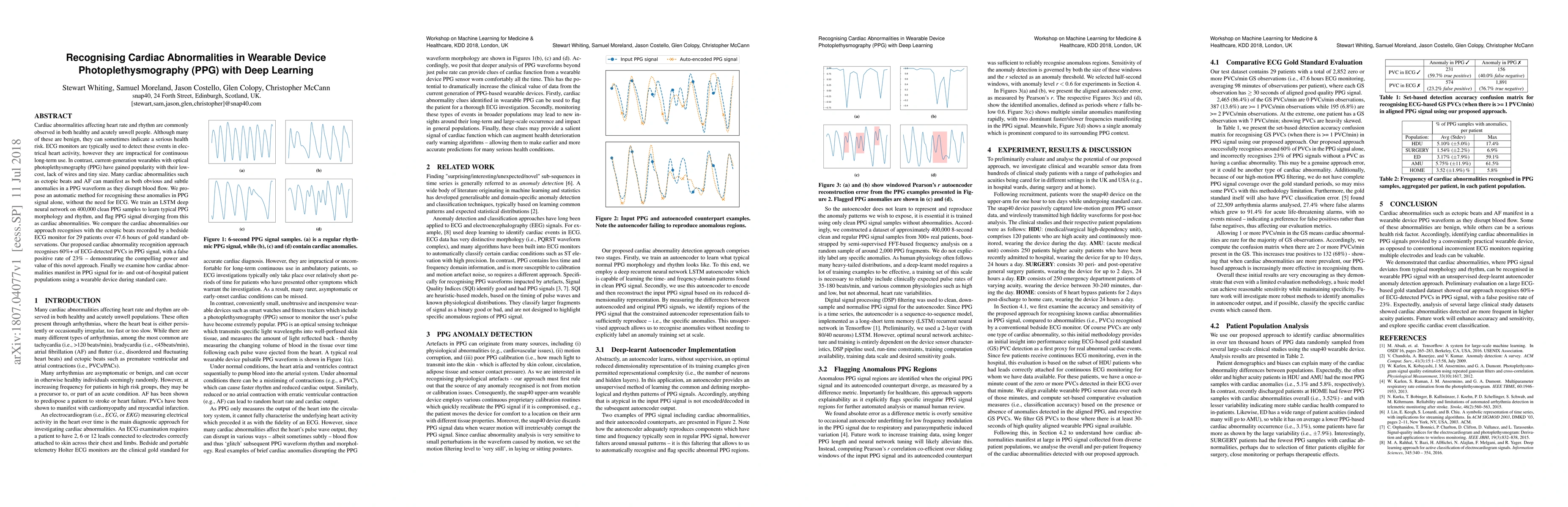 Cardiac abnormalities affecting heart rate and rhythm are commonly observed in both healthy and acutely unwell people. Although many of these are benign, they can sometimes indicate a serious health risk. ECG monitors are typically used to detect these events in electrical heart activity, however they are impractical for continuous long-term use. In contrast, current-generation wearables with optical photoplethysmography (PPG) have gained popularity with their low-cost, lack of wires and tiny size. Many cardiac abnormalities such as ectopic beats and AF can manifest as both obvious and subtle anomalies in a PPG waveform as they disrupt blood flow. We propose an automatic method for recognising these anomalies in PPG signal alone, without the need for ECG. We train an LSTM deep neural network on 400,000 clean PPG samples to learn typical PPG morphology and rhythm, and flag PPG signal diverging from this as cardiac abnormalities. We compare the cardiac abnormalities our approach recognises with the ectopic beats recorded by a bedside ECG monitor for 29 patients over 47.6 hours of gold standard observations. Our proposed cardiac abnormality recognition approach recognises 60%+ of ECG-detected PVCs in PPG signal, with a false positive rate of 23% - demonstrating the compelling power and value of this novel approach. Finally we examine how cardiac abnormalities manifest in PPG signal for in- and out-of-hospital patient populations using a wearable device during standard care.
