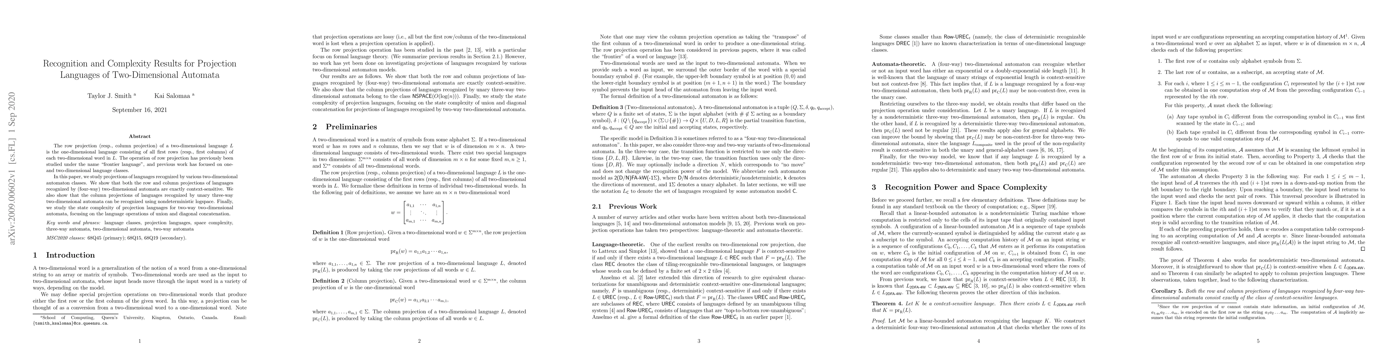 The row projection (resp., column projection) of a two-dimensional language $L$ is the one-dimensional language consisting of all first rows (resp., first columns) of each two-dimensional word in $L$. The operation of row projection has previously been studied under the name "frontier language", and previous work has focused on one- and two-dimensional language classes. In this paper, we study projections of languages recognized by various two-dimensional automaton classes. We show that both the row and column projections of languages recognized by (four-way) two-dimensional automata are exactly context-sensitive. We also show that the column projections of languages recognized by unary three-way two-dimensional automata can be recognized using nondeterministic logspace. Finally, we study the state complexity of projection languages for two-way two-dimensional automata, focusing on the language operations of union and diagonal concatenation.