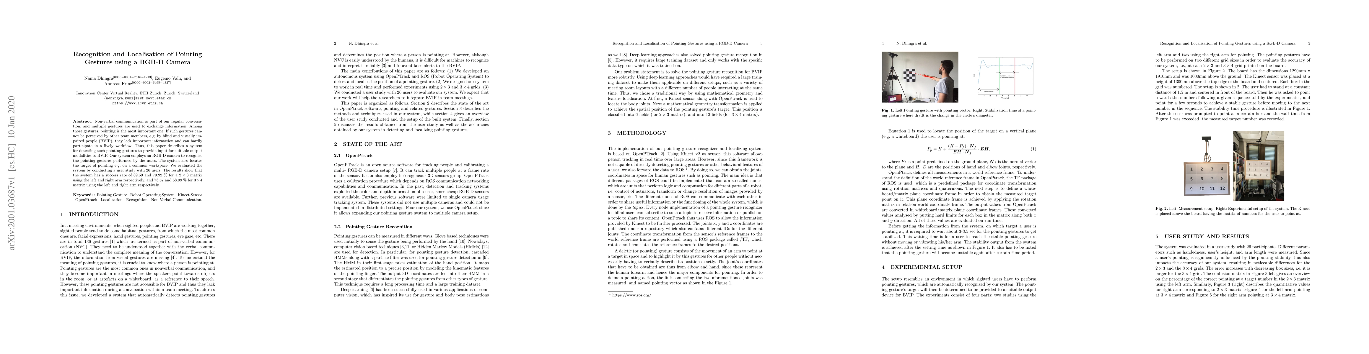 Non-verbal communication is part of our regular conversation, and multiple gestures are used to exchange information. Among those gestures, pointing is the most important one. If such gestures cannot be perceived by other team members, e.g. by blind and visually impaired people (BVIP), they lack important information and can hardly participate in a lively workflow. Thus, this paper describes a system for detecting such pointing gestures to provide input for suitable output modalities to BVIP. Our system employs an RGB-D camera to recognize the pointing gestures performed by the users. The system also locates the target of pointing e.g. on a common workspace. We evaluated the system by conducting a user study with 26 users. The results show that the system has a success rate of 89.59 and 79.92 % for a 2 x 3 matrix using the left and right arm respectively, and 73.57 and 68.99 % for 3 x 4 matrix using the left and right arm respectively.