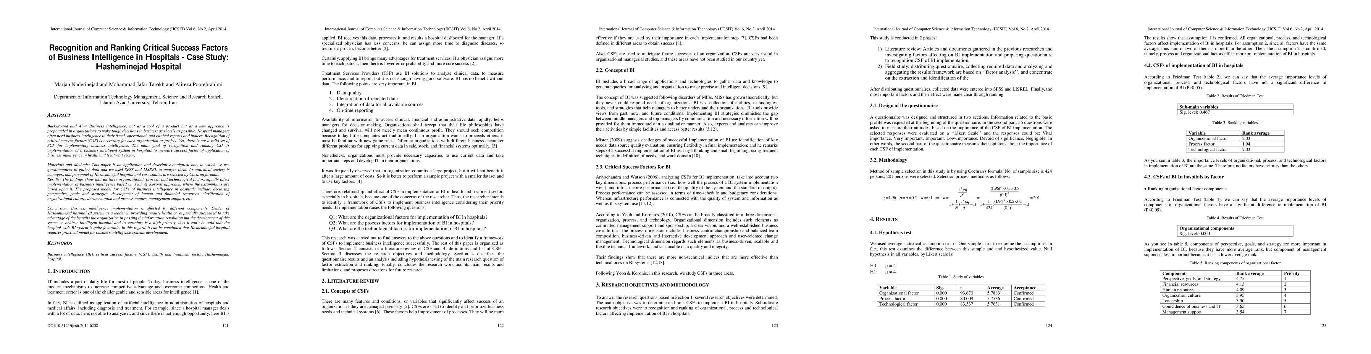 This study identifies and ranks critical success factors for business intelligence implementation in hospitals, focusing on Hasheminejad Hospital. Findings reveal that organizational, process, and technological factors equally impact BI success, emphasizing the need for a practical model for BI systems development in healthcare settings.