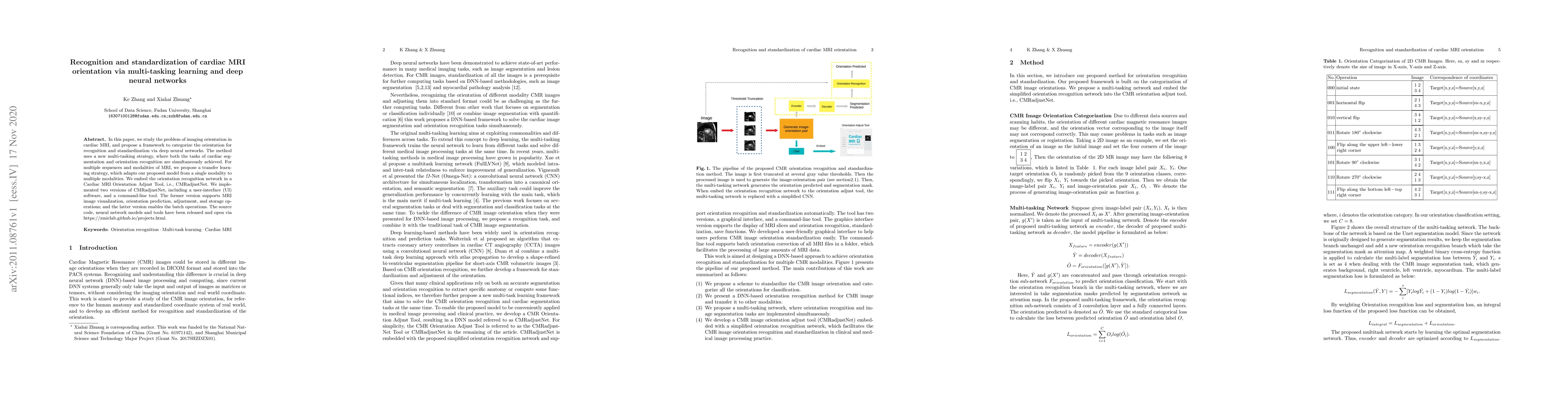 This paper proposes a deep learning framework using multi-tasking learning to recognize and standardize cardiac MRI orientation. The method integrates cardiac segmentation and orientation recognition, employing transfer learning for adaptability across different MRI modalities and sequences.